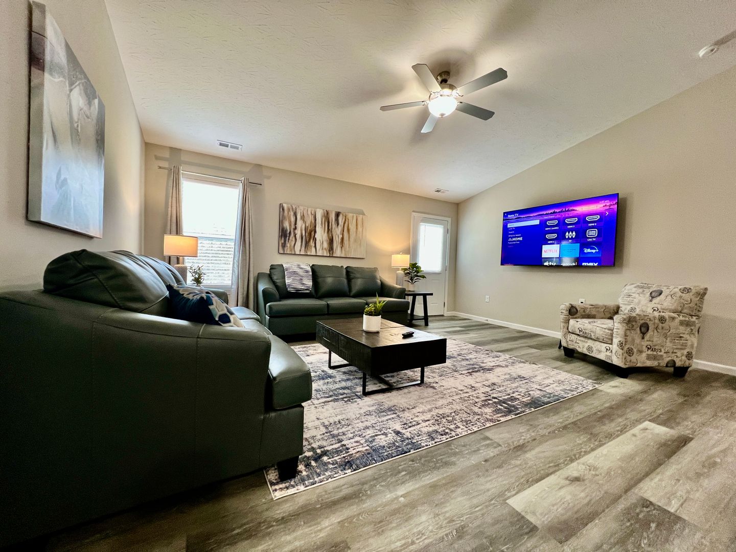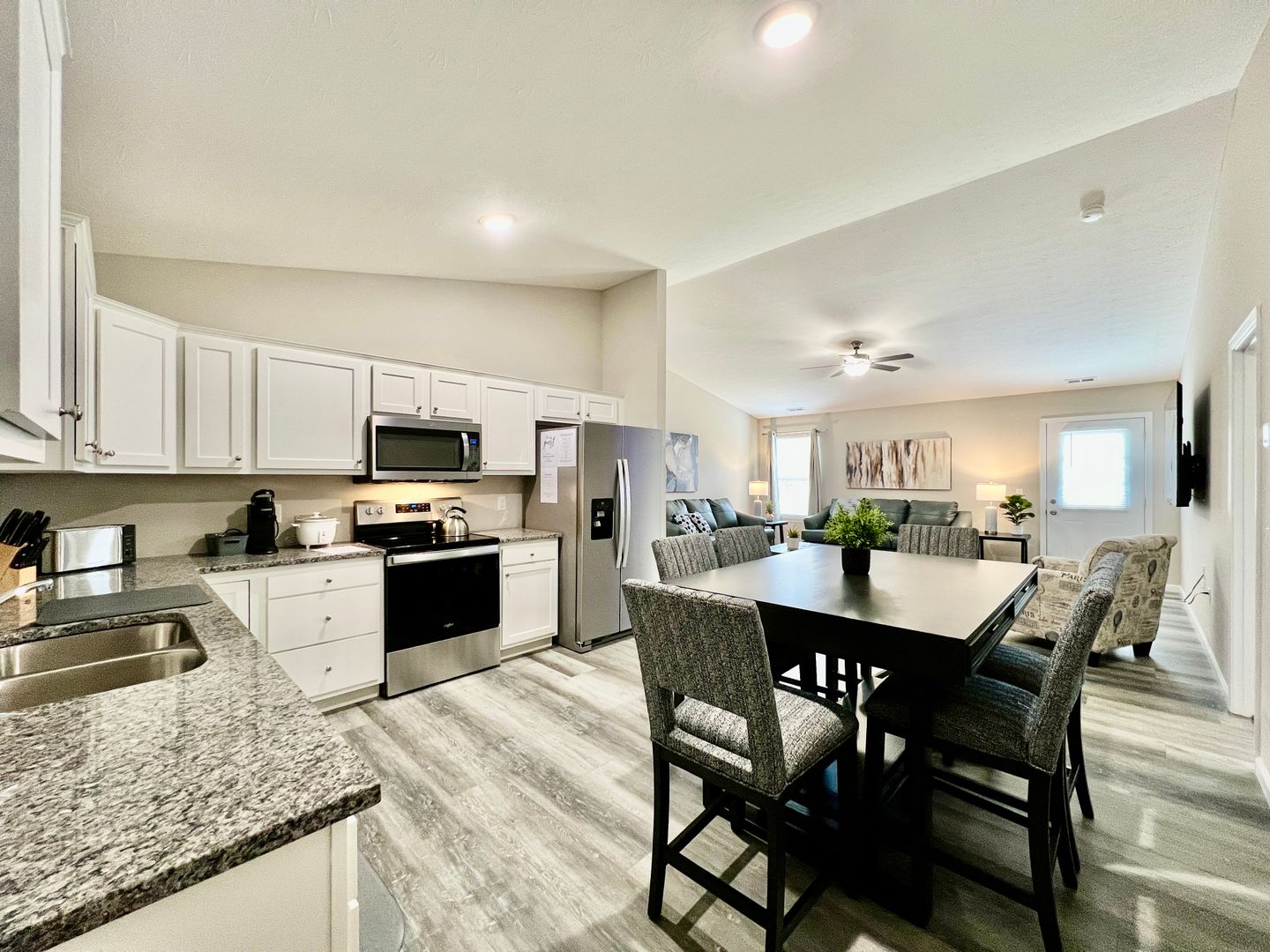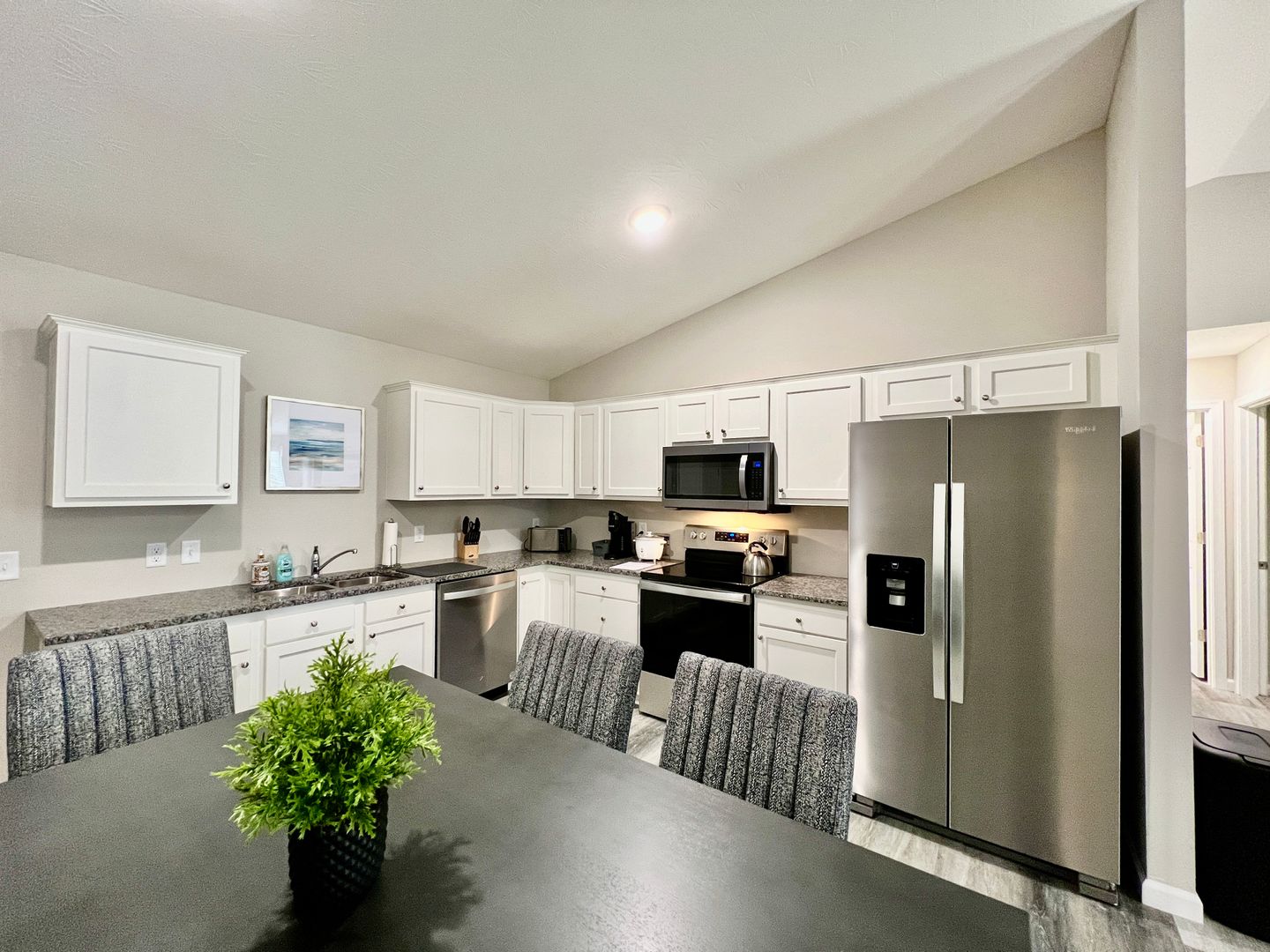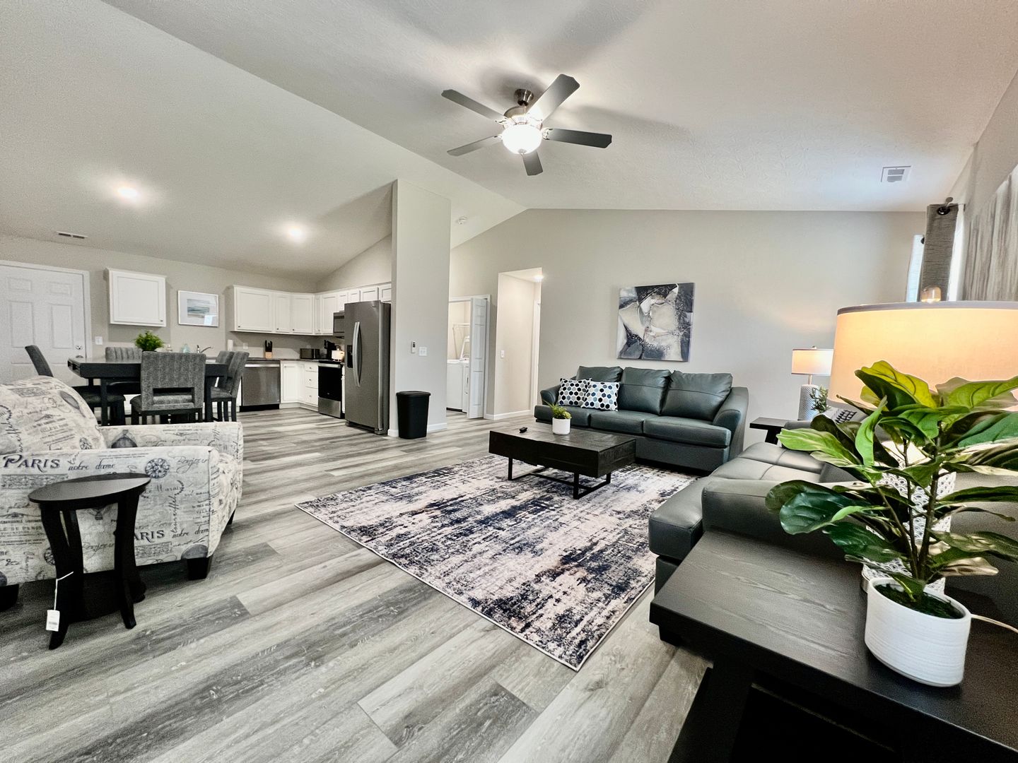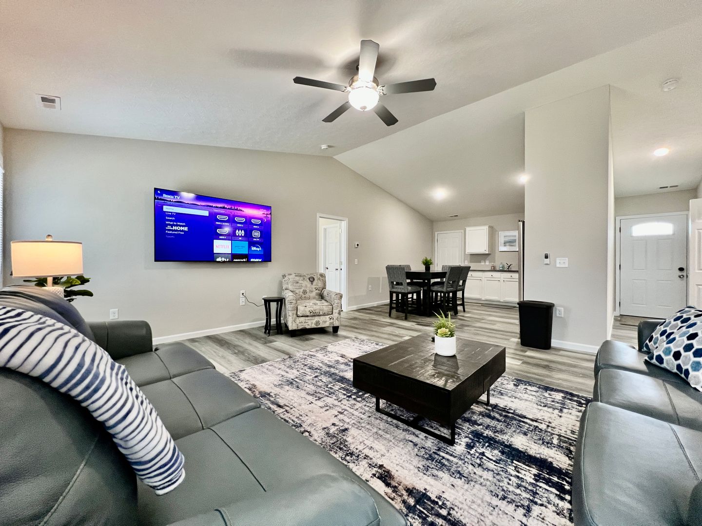 A blend of comfort, style, and convenience greets you as soon as you enter our newly built ranch home. While decorating this inviting retreat, we have worked hard to create a home away from home feeling for our guests. The open-concept floor plan in the living space allows room for many guests. Everyone in your group will have room to mingle and relax.