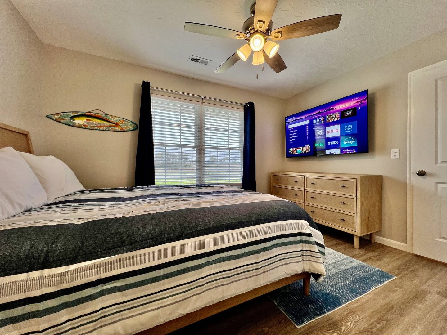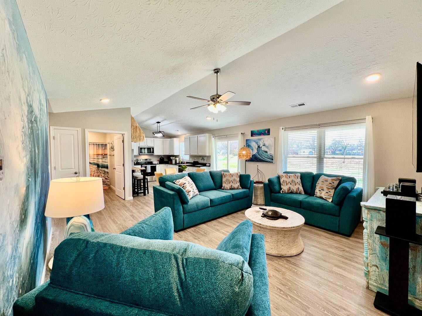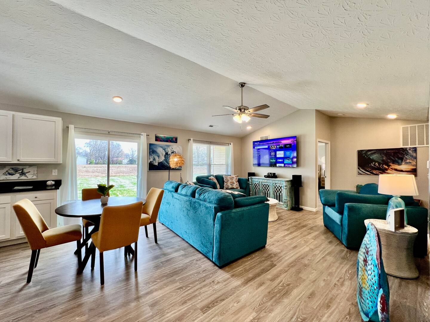 A blend of comfort, style, and convenience greets you as soon as you enter our newly built ranch home. While decorating this inviting retreat, we have worked hard to create a home away from home feeling for our guests. The open-concept floor plan in the living space allows room for many guests. Everyone in your group will have room to mingle and relax.