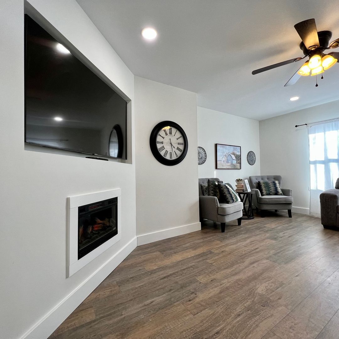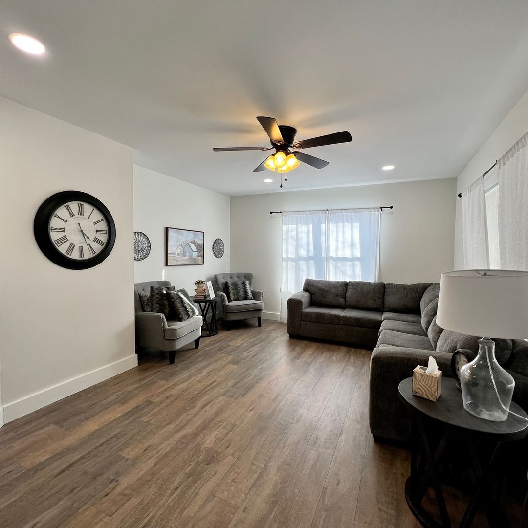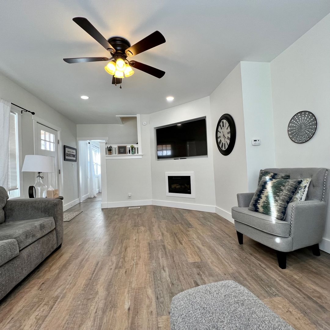 As you walk in the front door you will find yourself in our cozy living area with a working electric fireplace, large smart TV, comfy sectional and a cute sitting area.