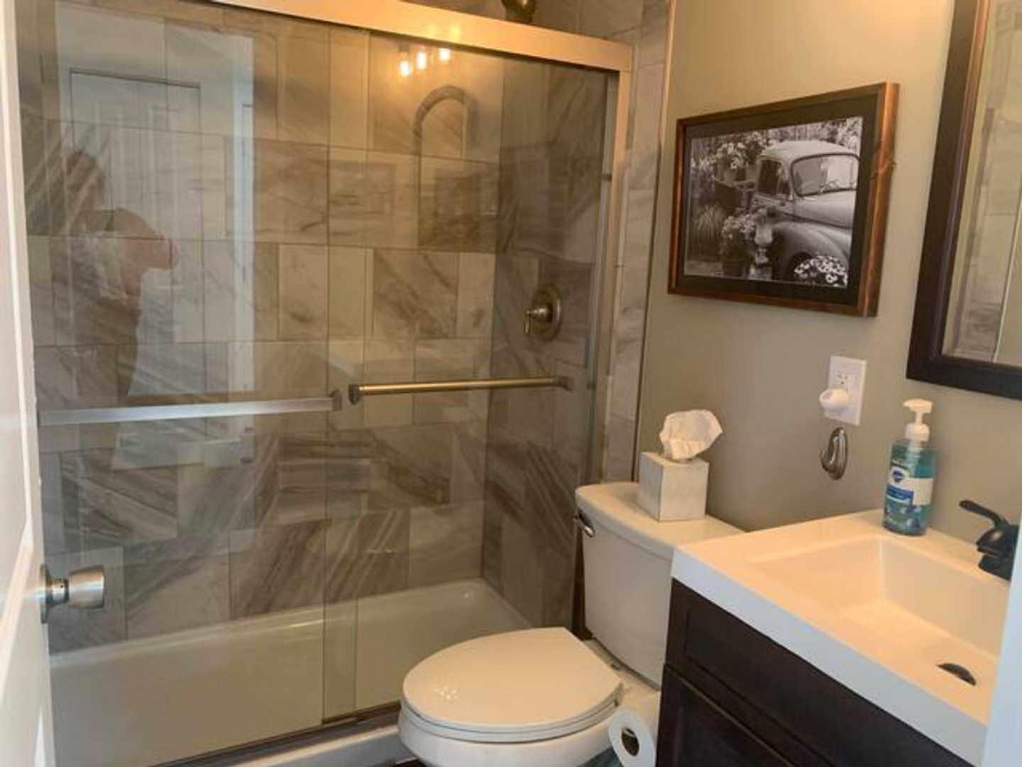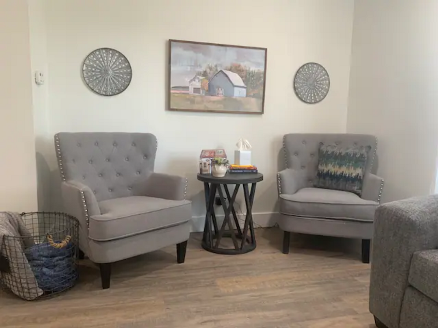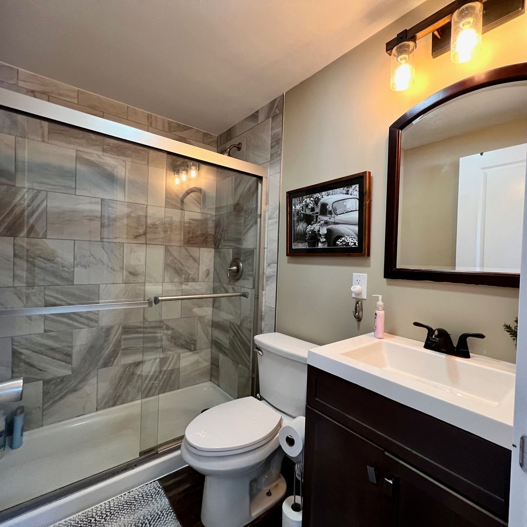 As you walk in the front door you will find yourself in our cozy living area with a working electric fireplace, large smart TV, comfy sectional and a cute sitting area.