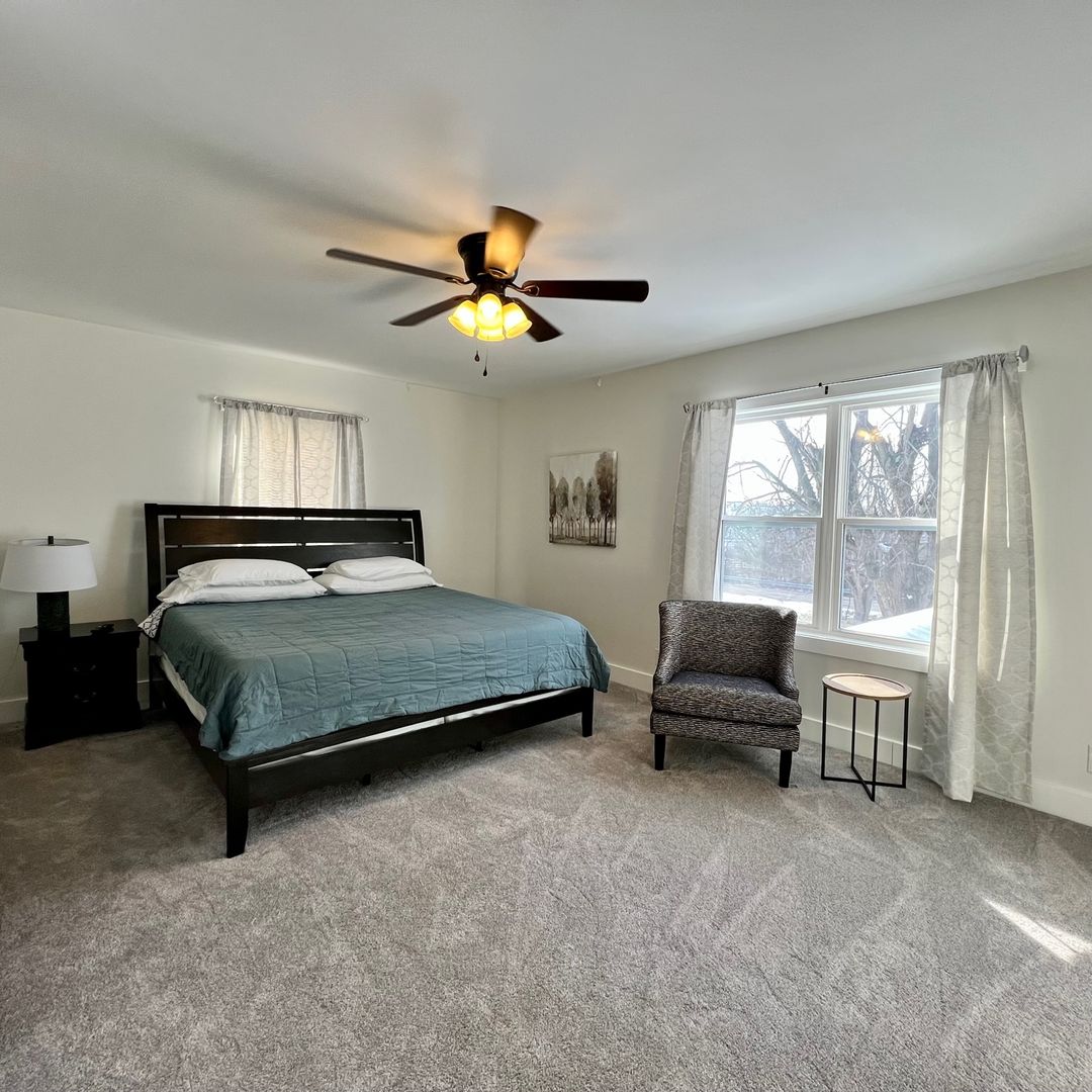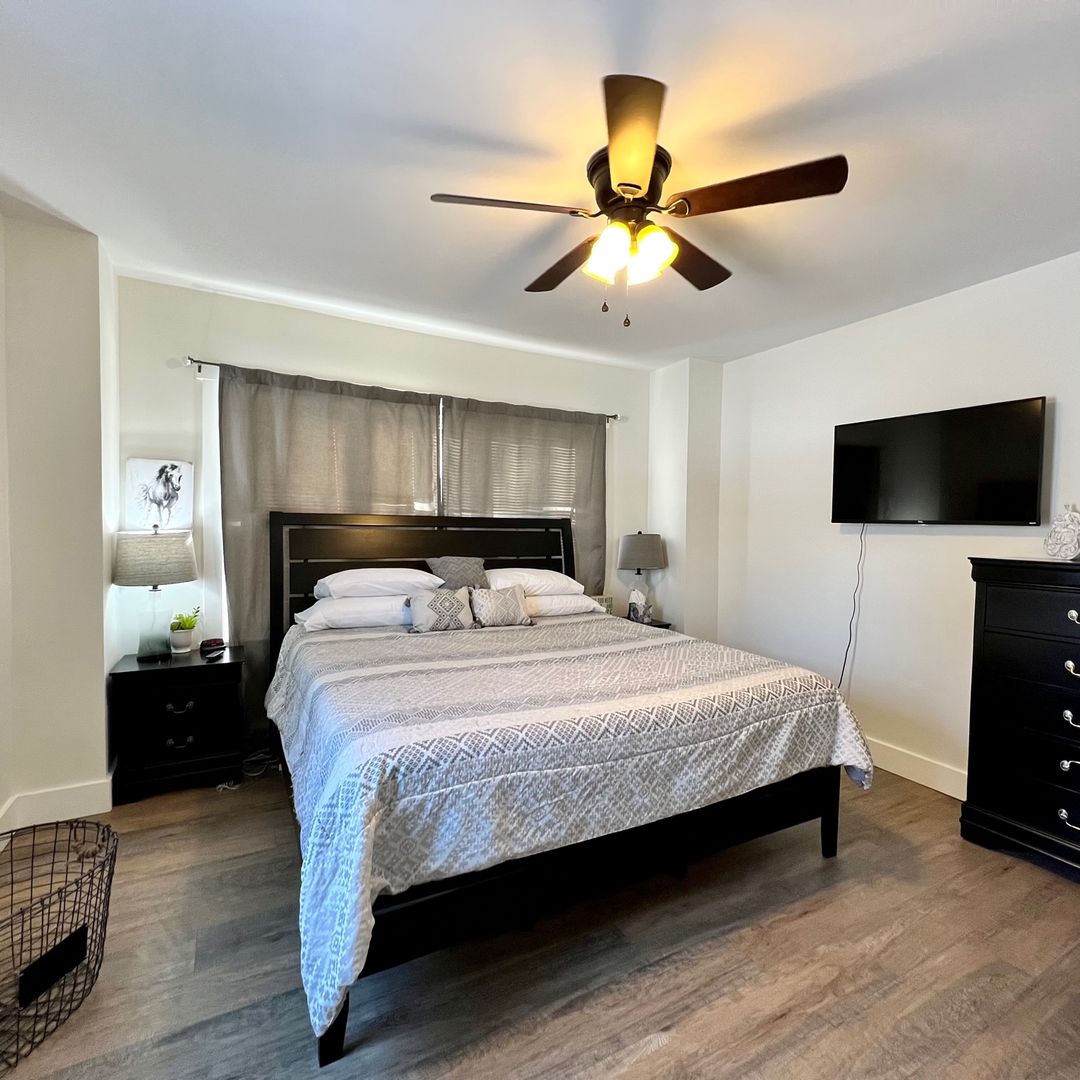 This home features three bedrooms, one on the main floor and two upstairs. One of our king bedrooms is located at the back of the house with plenty of storage, ceiling fan and smart TV. The king bedroom upstairs also offers all of these features. The twin bedroom (with two beds) is just as amazing, but comes sans television.