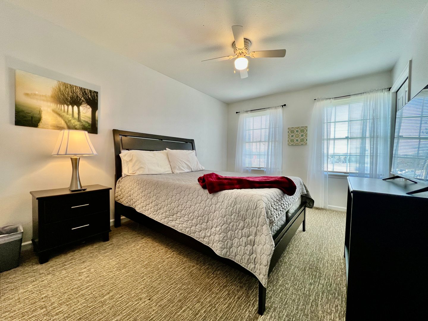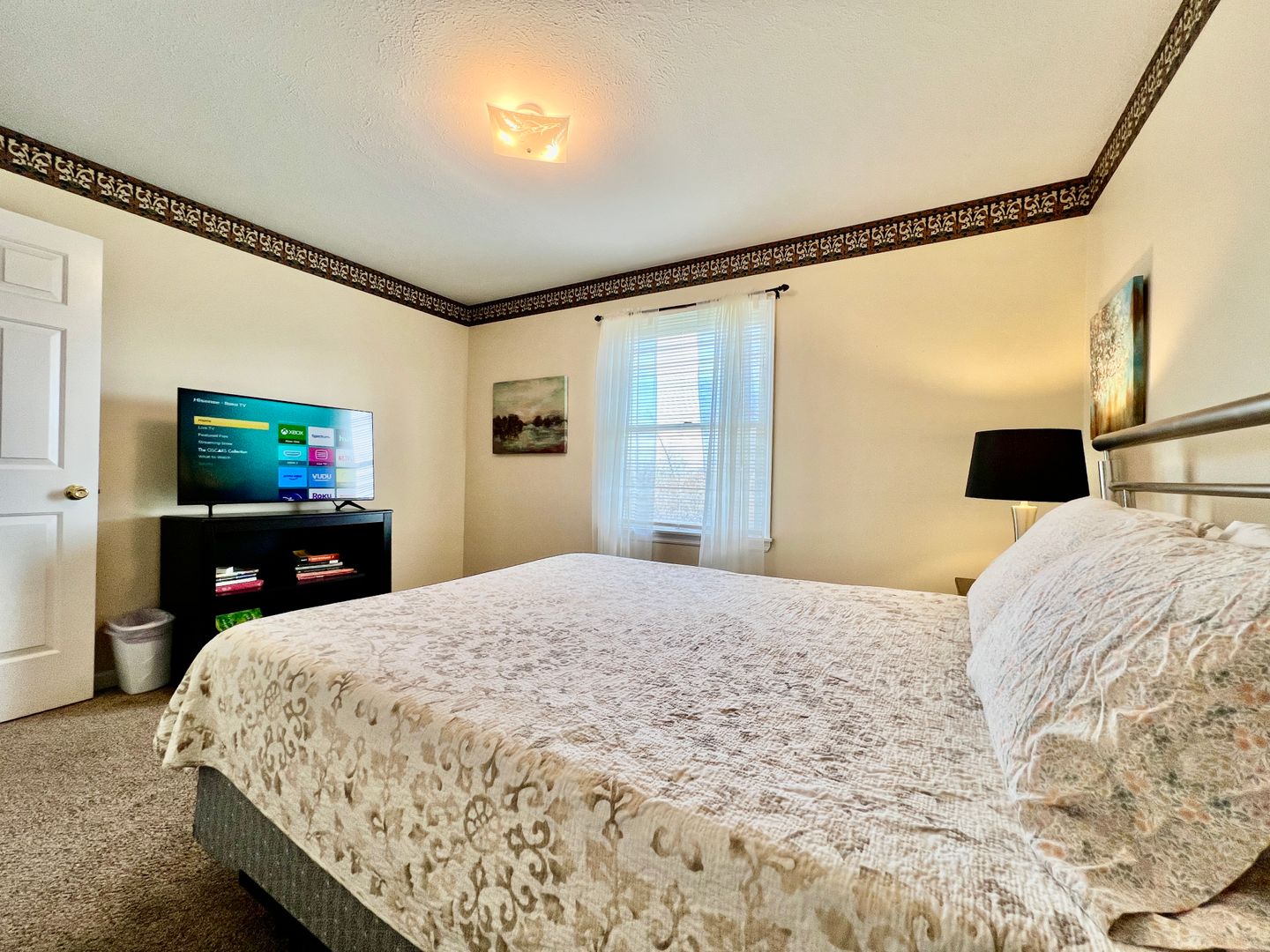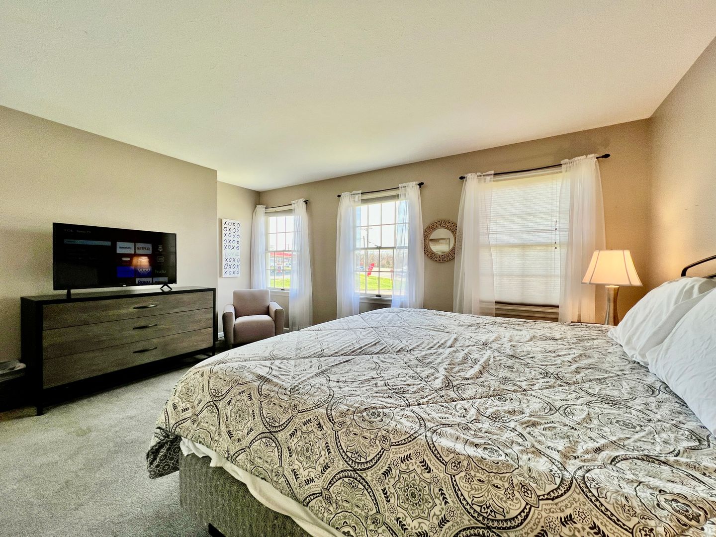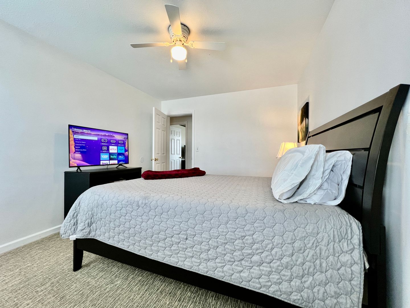 The bedrooms and bathrooms are located upstairs. Each bedroom is fully carpeted and equipped with a Roku TV. The master bedroom features an ensuite bathroom with a long vanity countertop and a walk-in closet for storage.