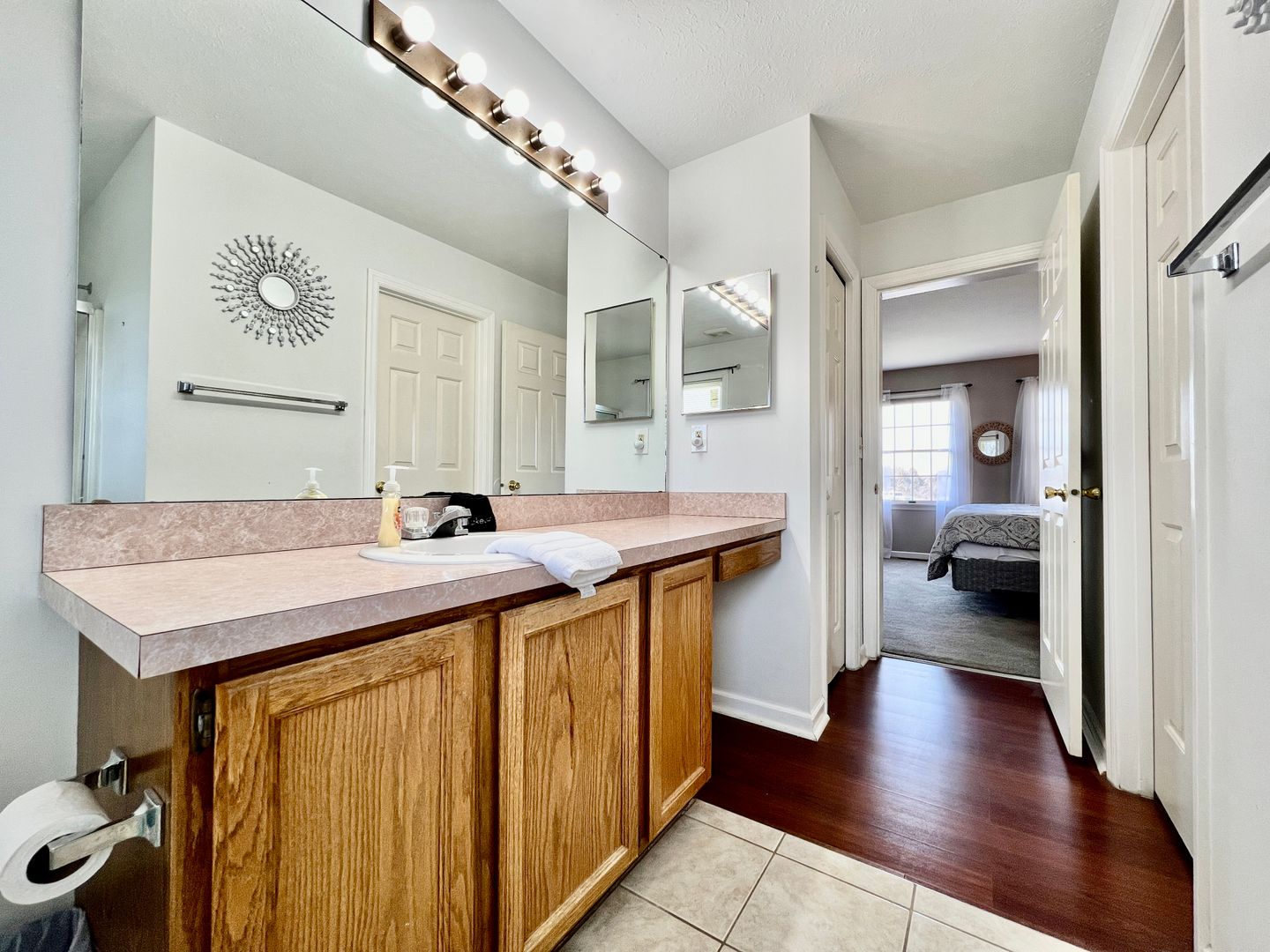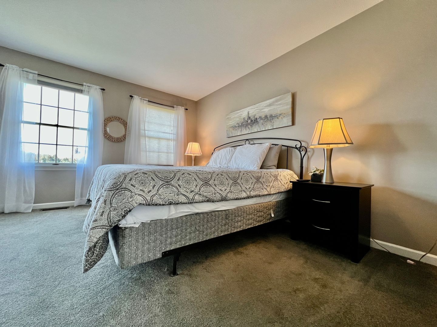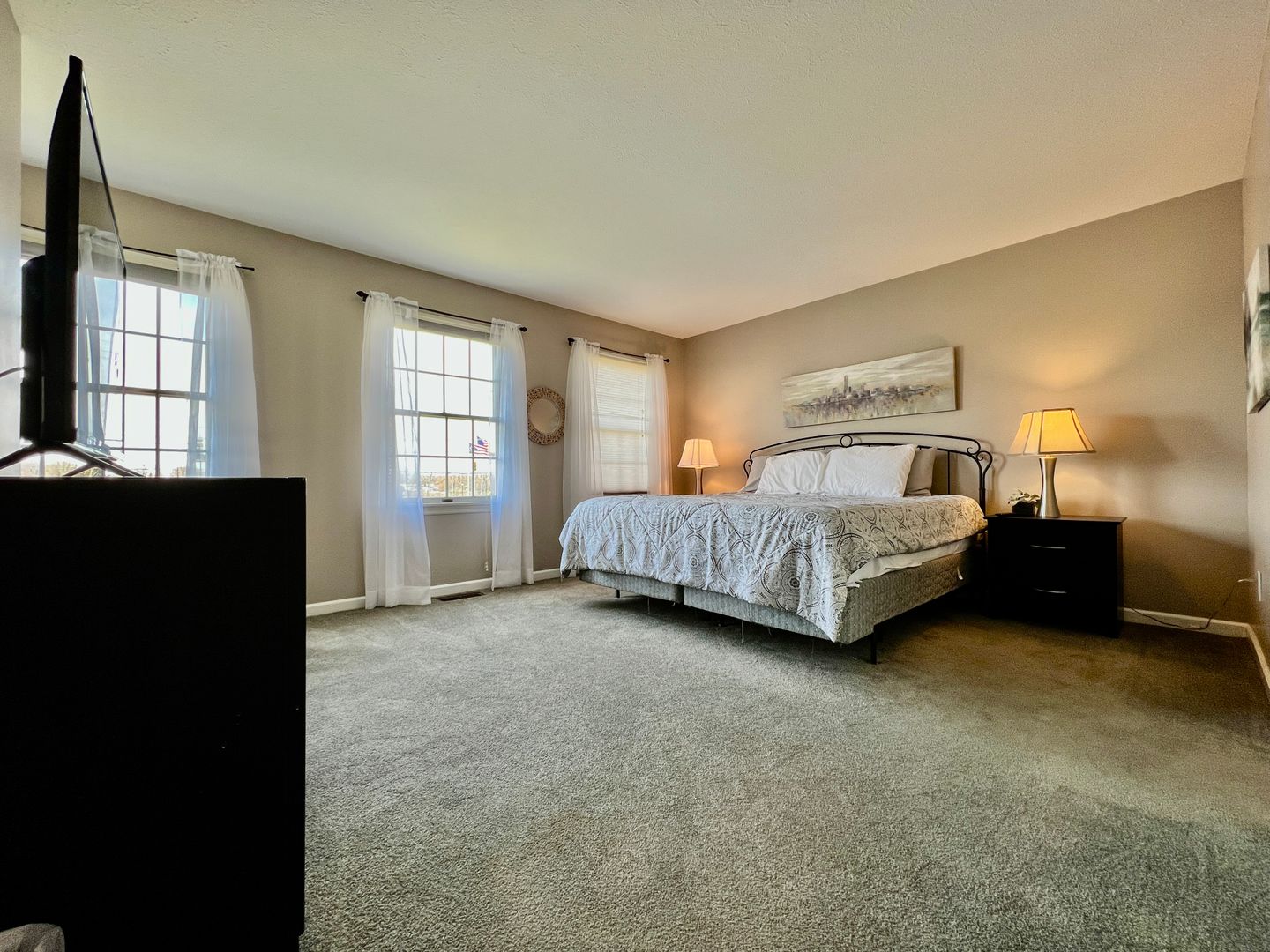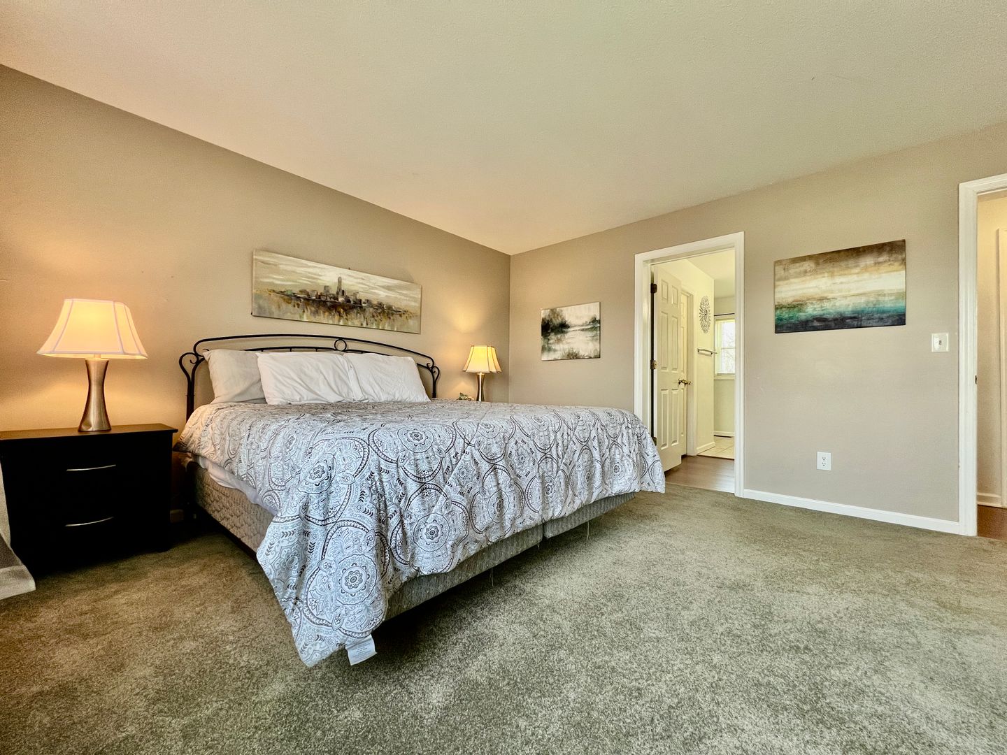 The bedrooms and bathrooms are located upstairs. Each bedroom is fully carpeted and equipped with a Roku TV. The master bedroom features an ensuite bathroom with a long vanity countertop and a walk-in closet for storage.