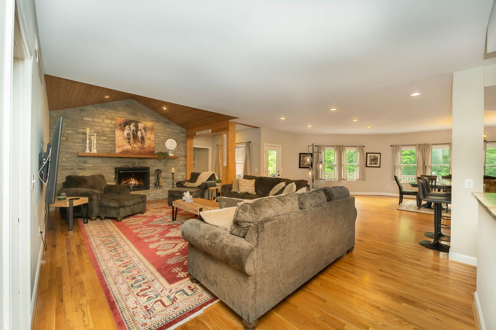 Large open spaces. Room to share and laugh. This home features a large gathering space that has the kitchen, dining, and living rooms all open and flowing into each other. There are also 2 private bedrooms on the first floor, both with a master suite. The home has its own private drive and sits about 600 feet off the road.