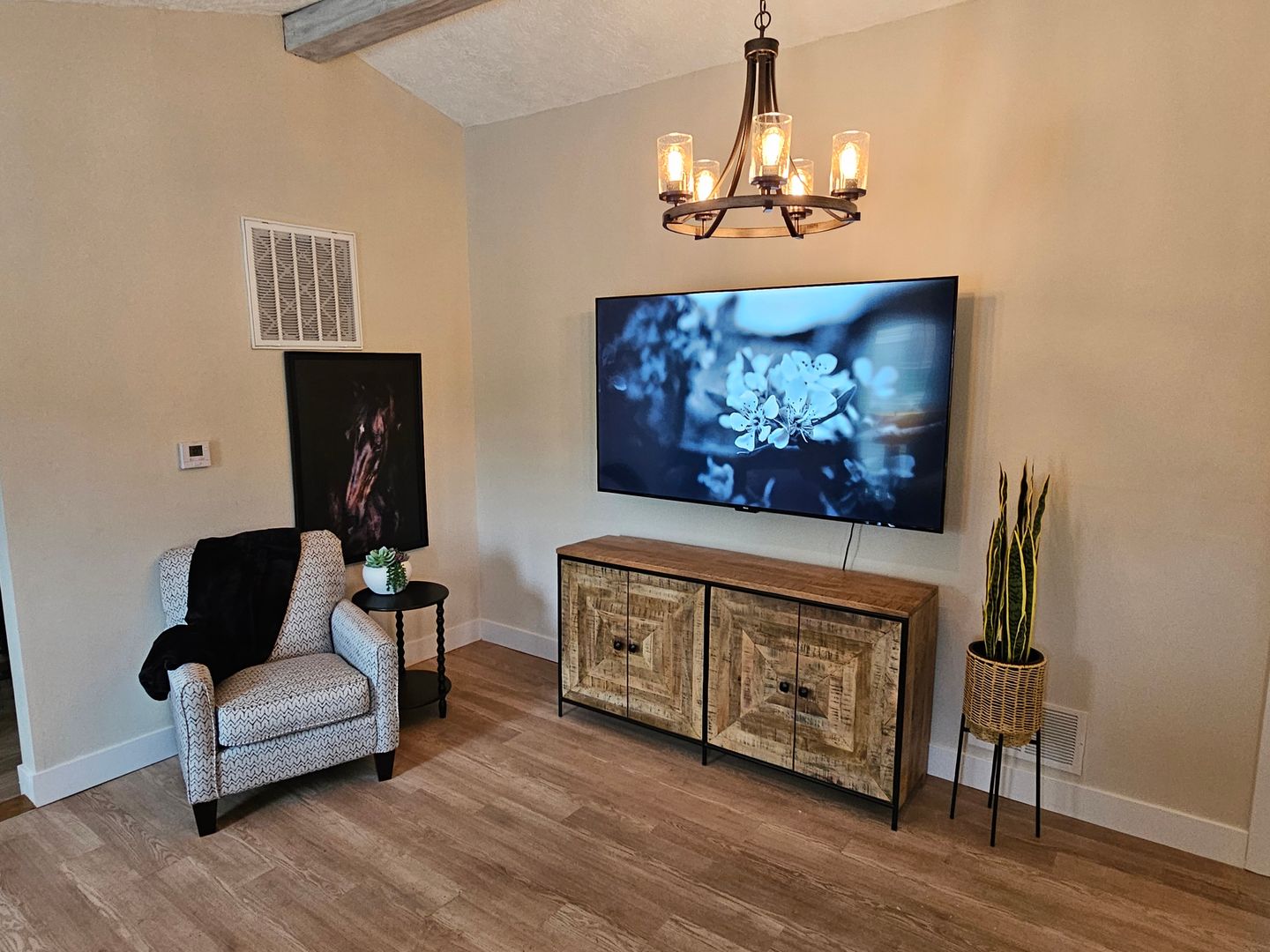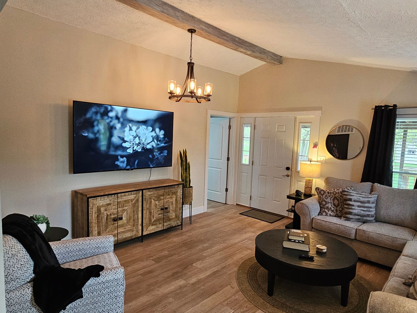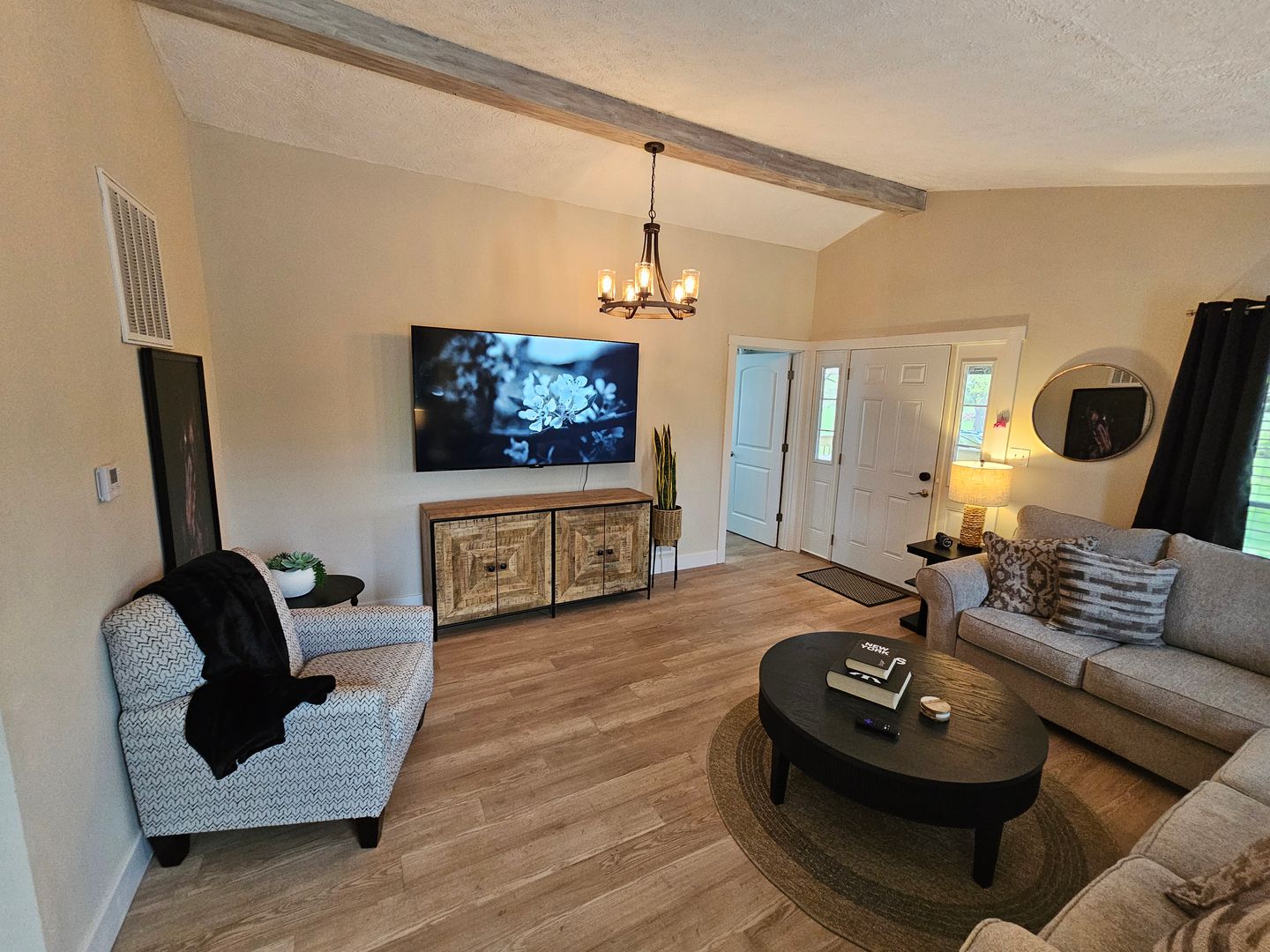 When you enter the home, you are greeted with a cozy living room area with large, comfortable sectional sofa, an accent chair and a 75" Smart TV .