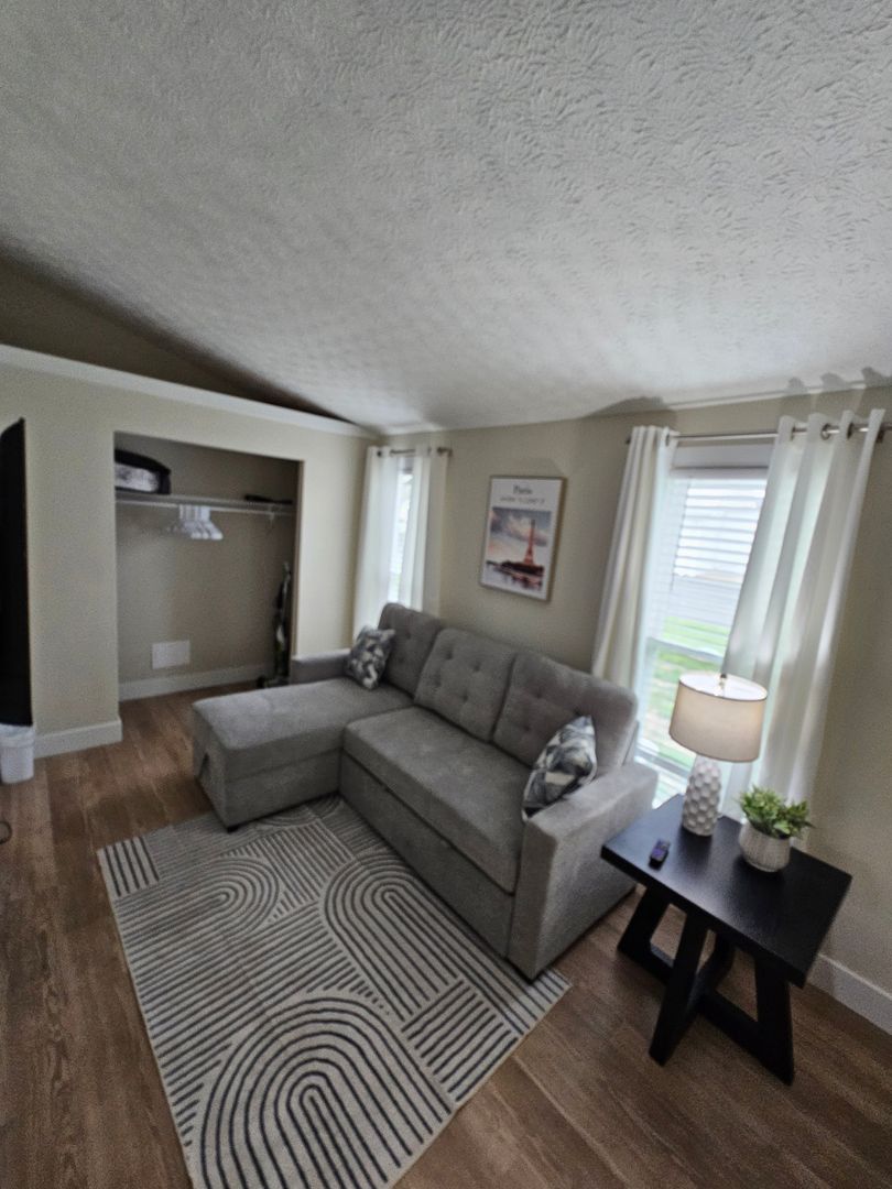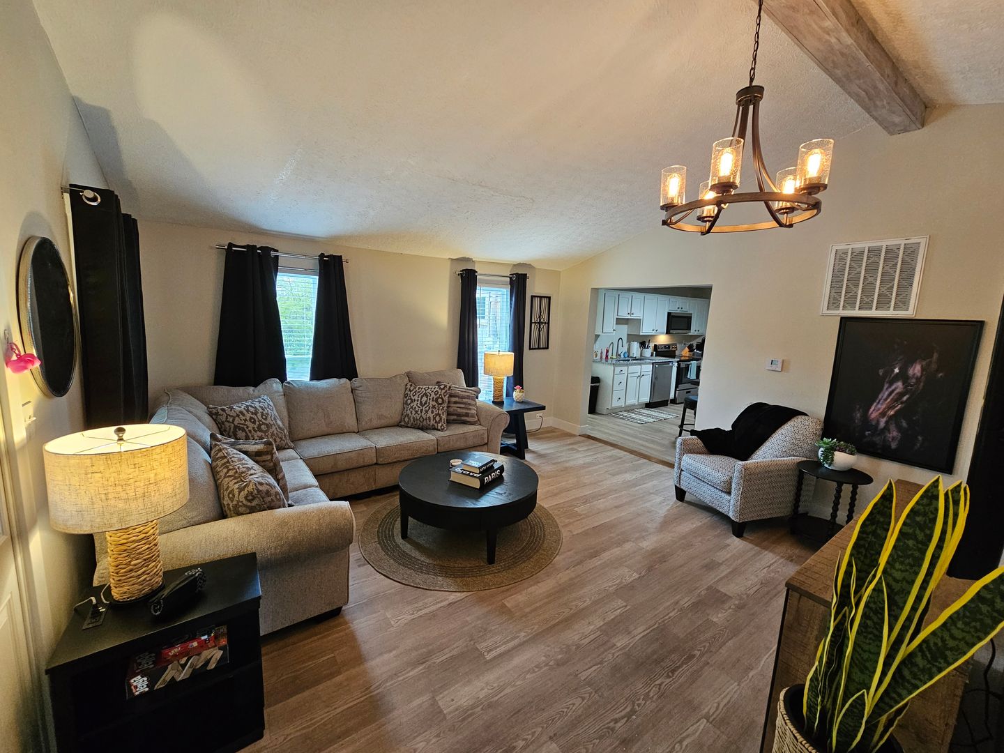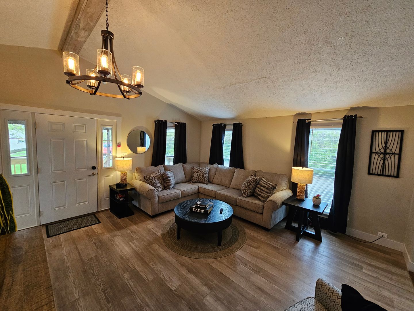 When you enter the home, you are greeted with a cozy living room area with large, comfortable sectional sofa, an accent chair and a 75" Smart TV .