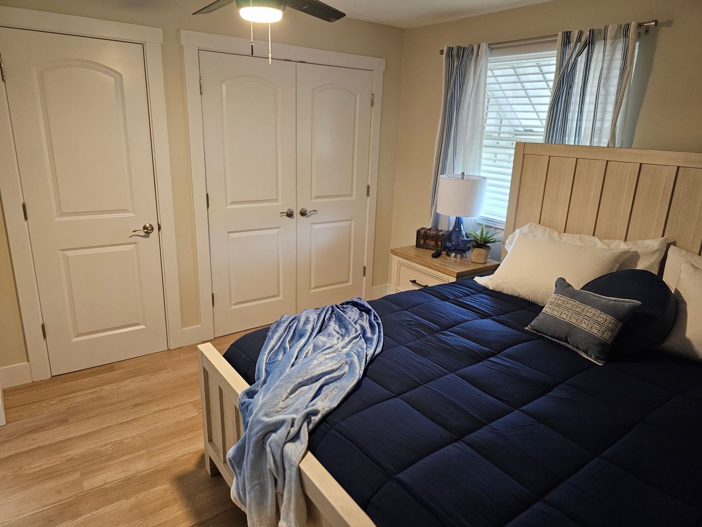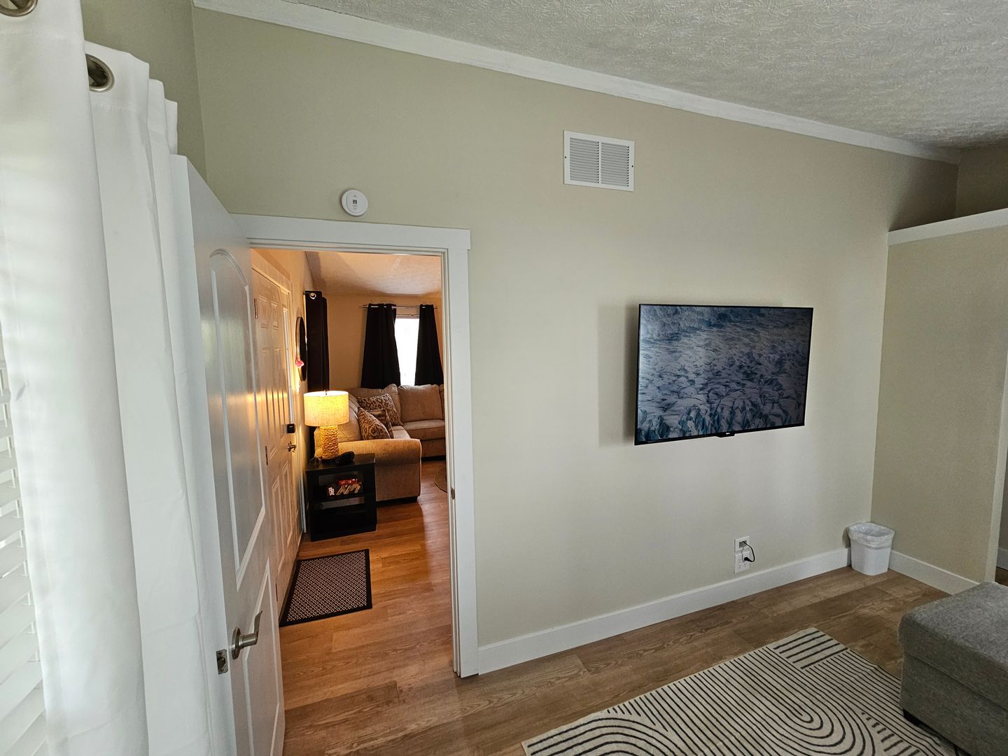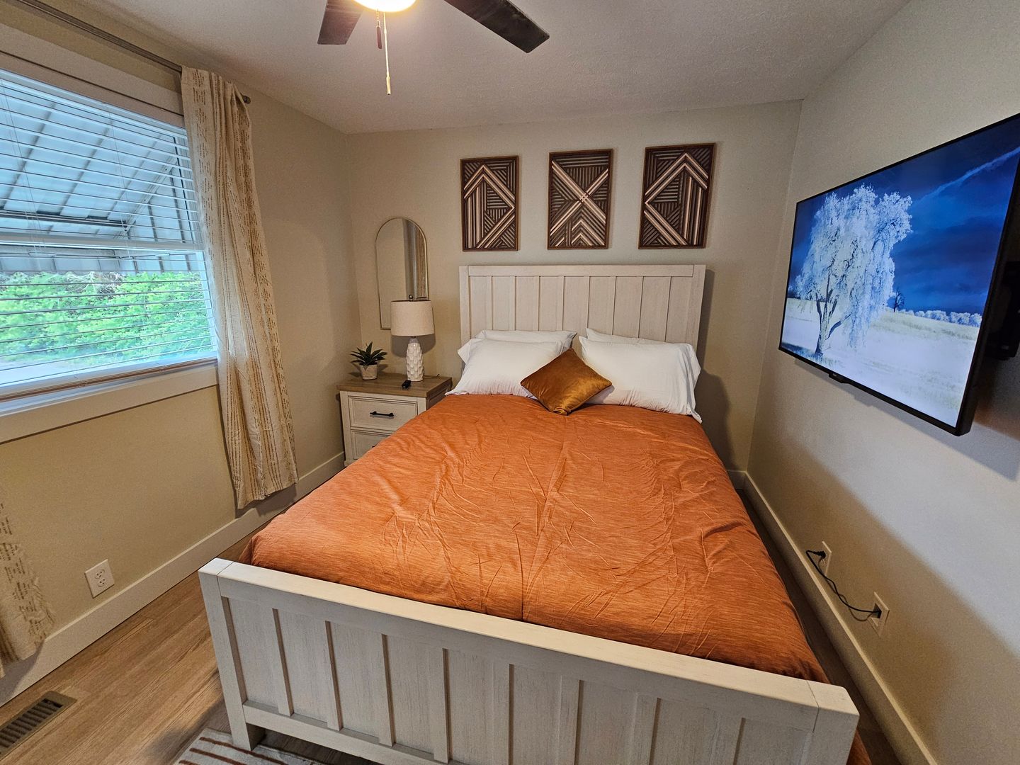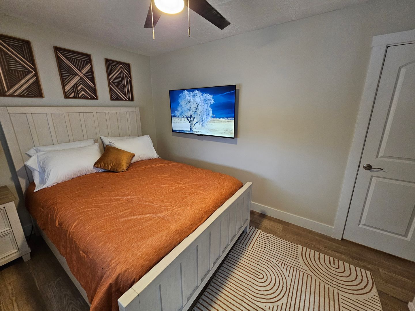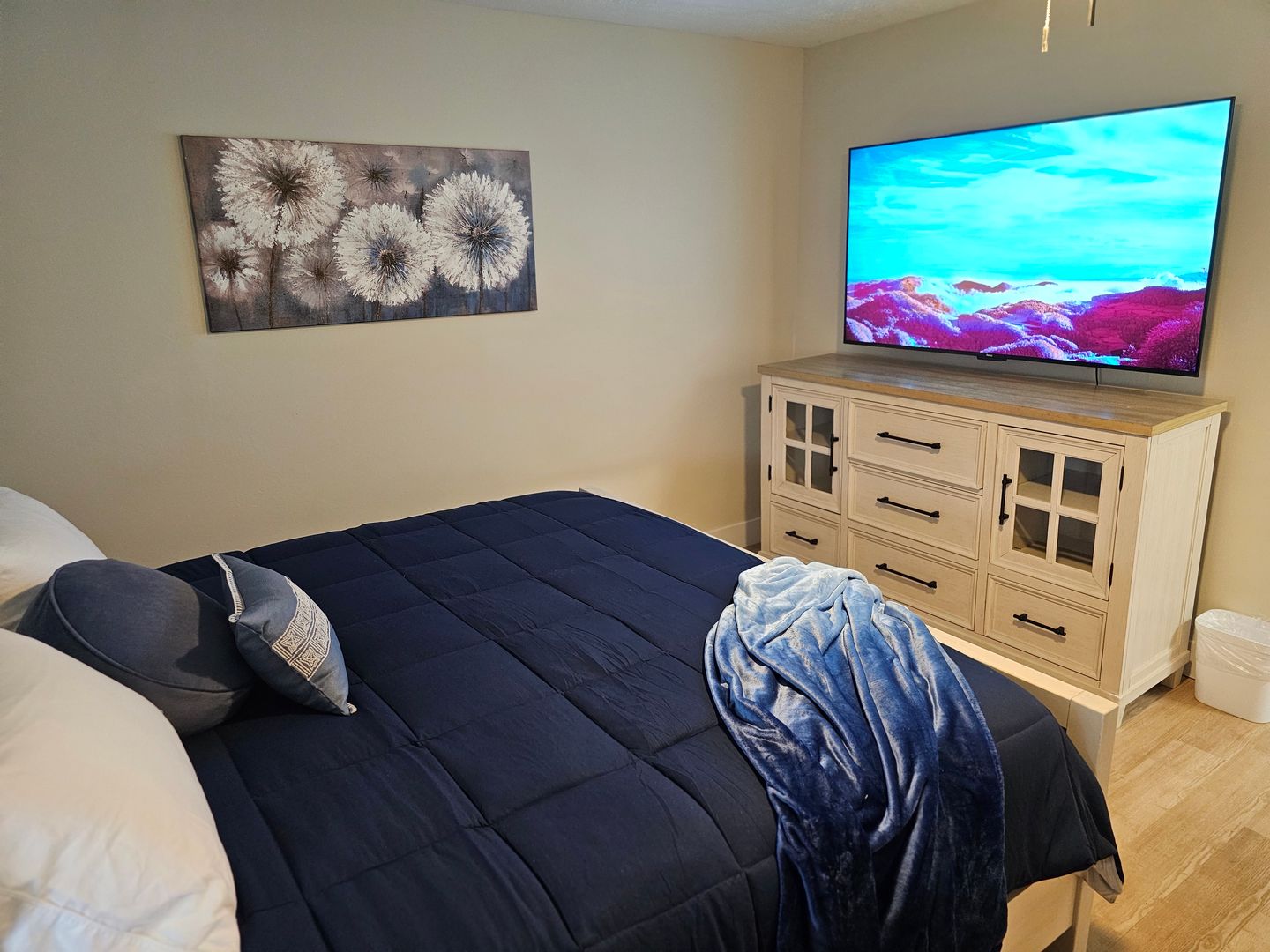 Continuing down the hall from the bathroom is bedroom 2. This bedroom features a queen-size bed and 55" Smart TV as well as a walk-in closet.