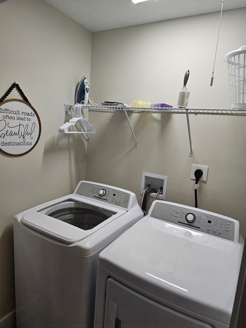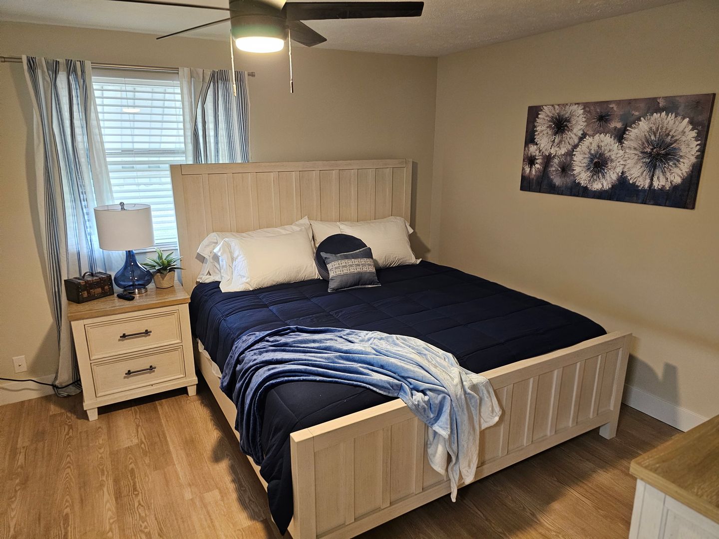 To one side of the kitchen is the master bedroom. The master bedroom features a king-size bed and 65" Smart TV. There is plenty of space to unpack and relax before bedtime. Between the master bedroom and kitchen lies the laundry area equipped with full size washer and dryer as well as an iron, ironing pad and laundry supplies.