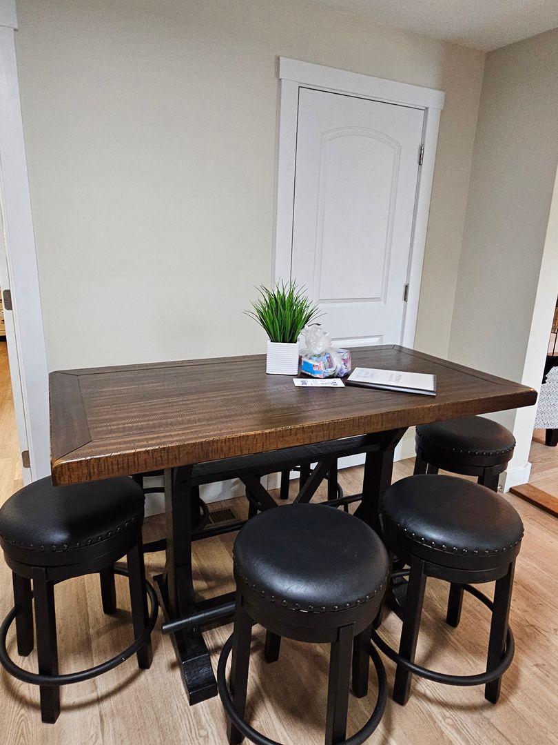 The kitchen is smaller in size, but it is fully equipped with everything you need to cook an enjoyable meal. It has an oven/range, a full-size refrigerator, a microwave, and a dishwasher. There is a table off the kitchen area with seating for six. Sit and enjoy a family meal or game night.