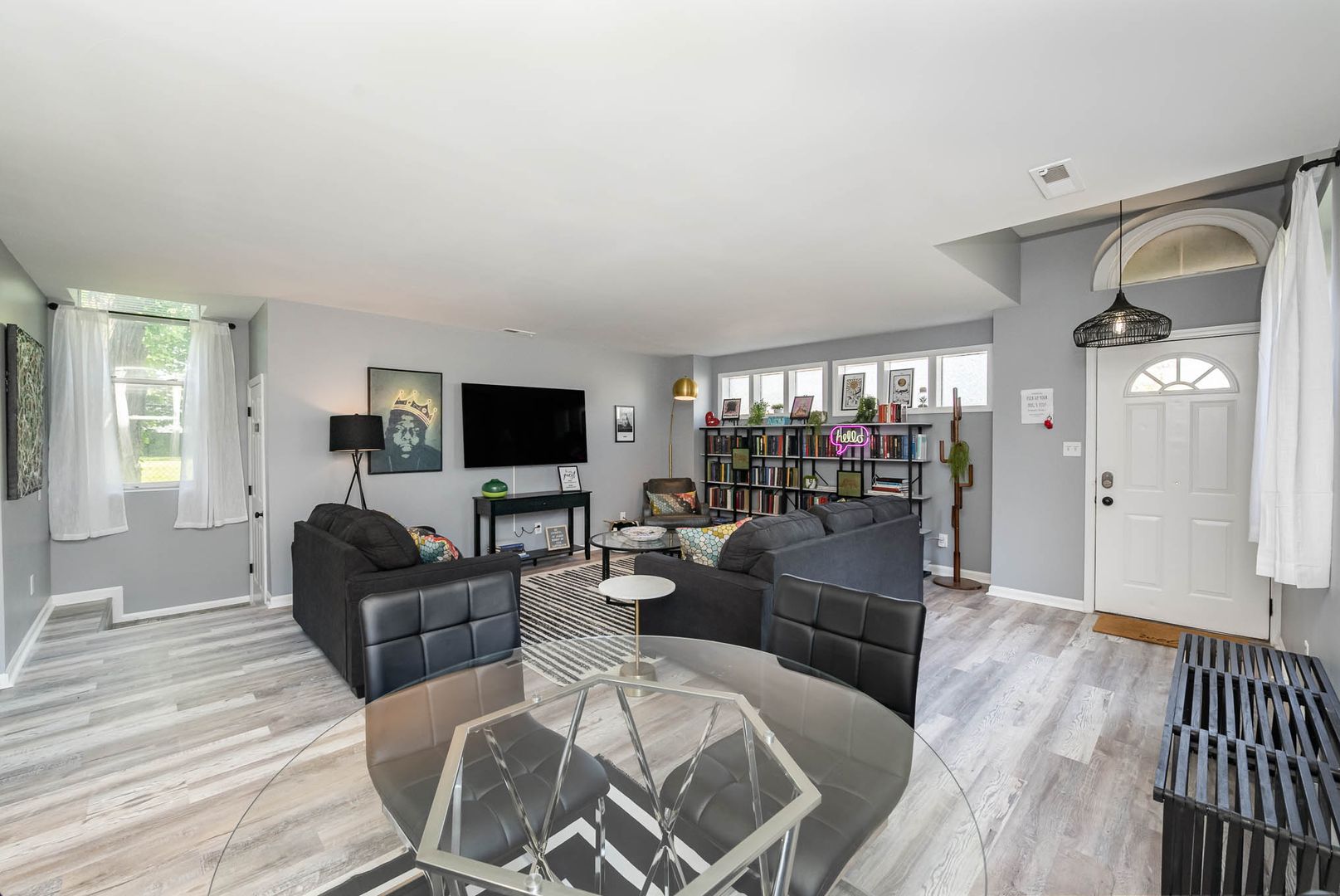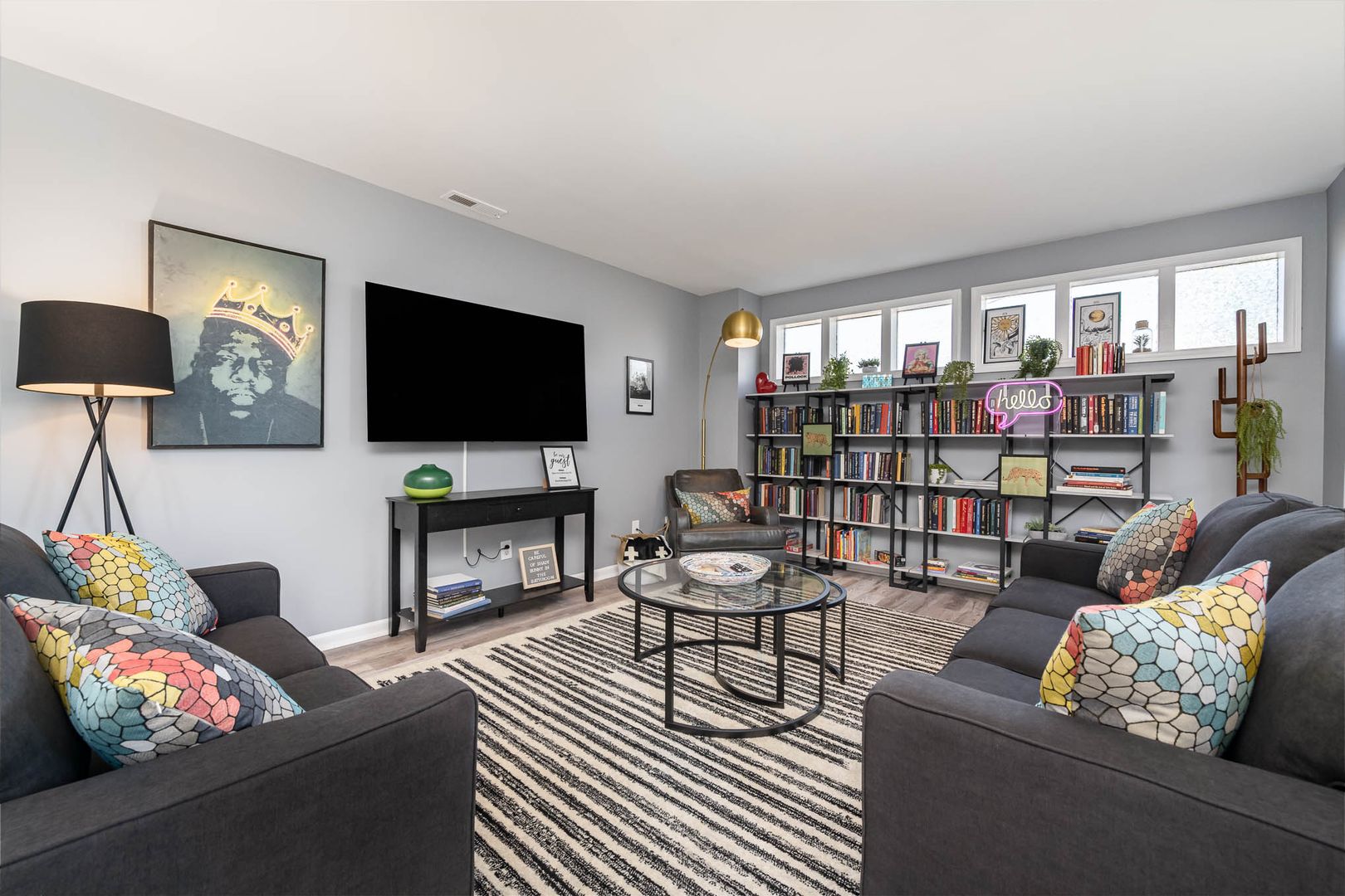 The living room has tons of natural light that flows through the tall windows. Cozy up on the sofas or sitting chair and watch your favorite movie or show on your large, flat-screen Roku TV. There is a large bookshelf with many books and board games for you to utilize during your stay. In order to sleep 5 guests in this apartment, one person will be sleeping on the couch.