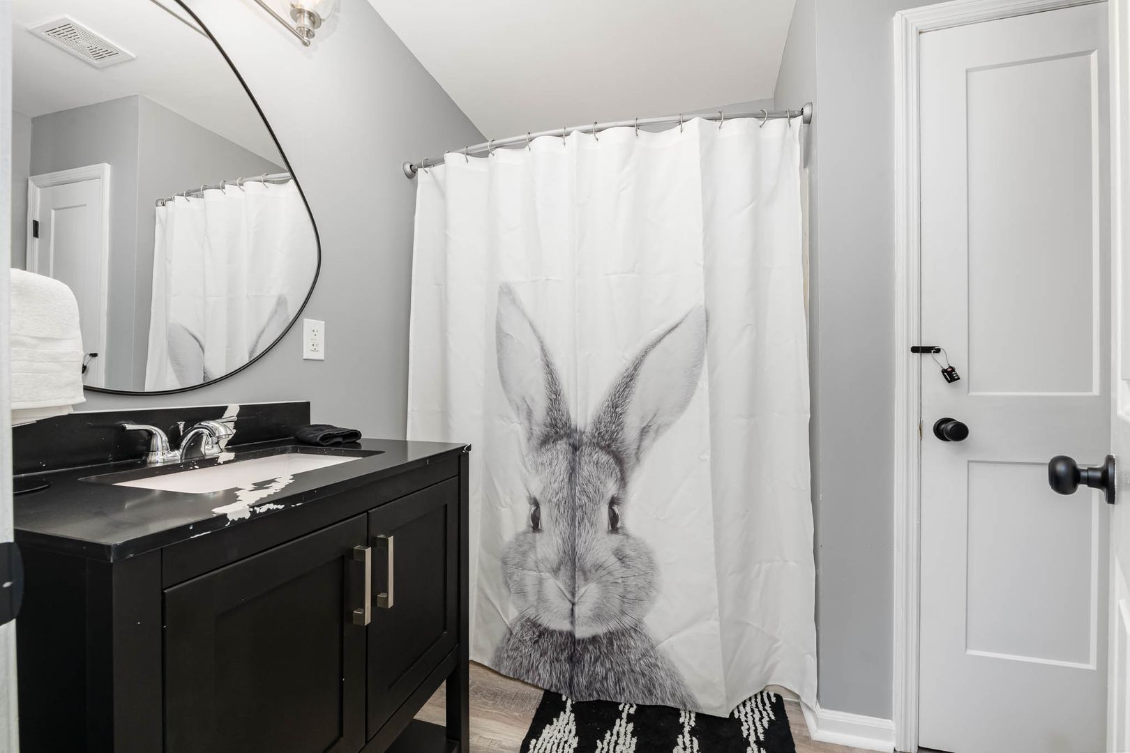 The two bedrooms and living area share a full-size bathroom. The bathroom is super cute and features a tub/shower combination with storage under the sink. We provide towels and basic consumable toiletries for you to use during your stay.