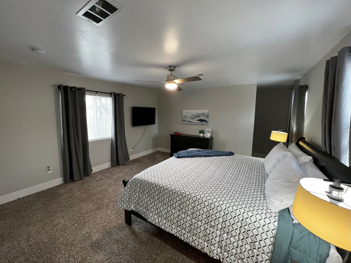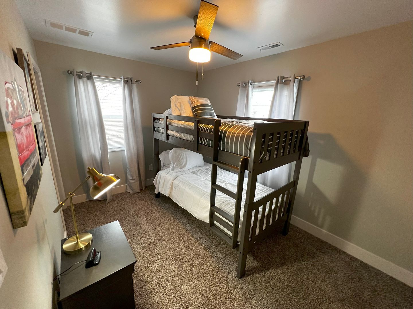 There are three bedrooms in this home. One king bedroom is located towards the back and has it's own bathroom with walk-in shower, ceiling fan, walk-in closet and Smart TV. The second king bedroom is located just to the right of the entrance and also has a smart TV. You'll also find the twin bedroom with bunkbeds right next to that. These two bedrooms share a bathroom with a shower/tub combination.