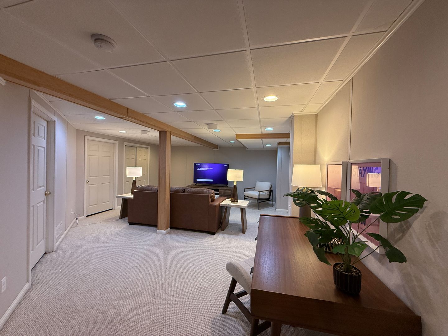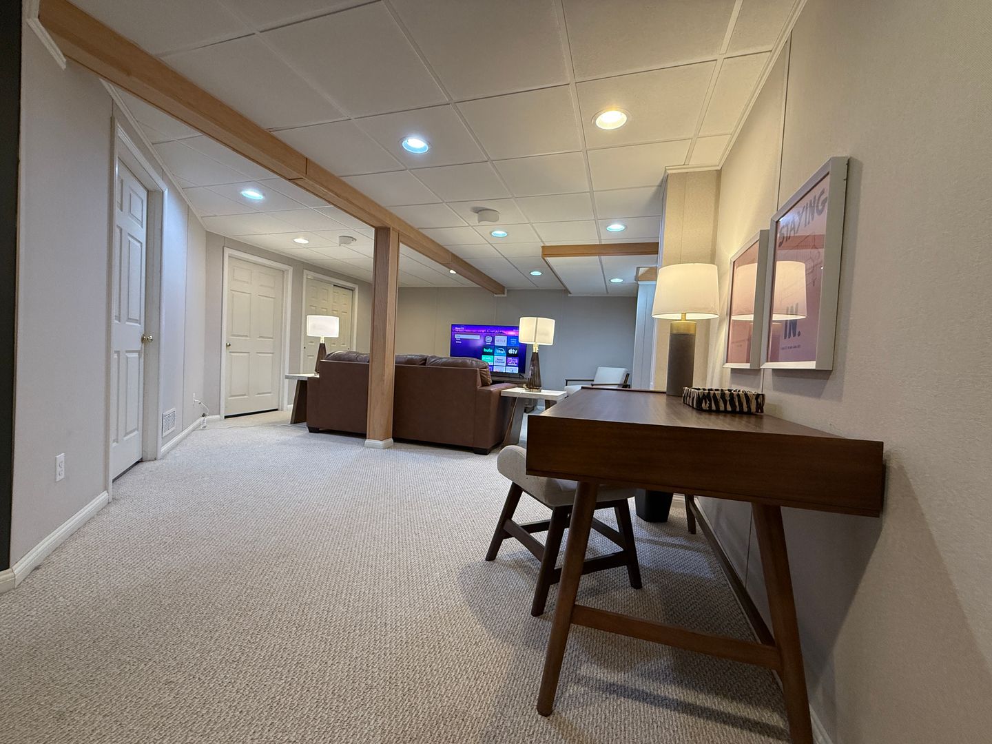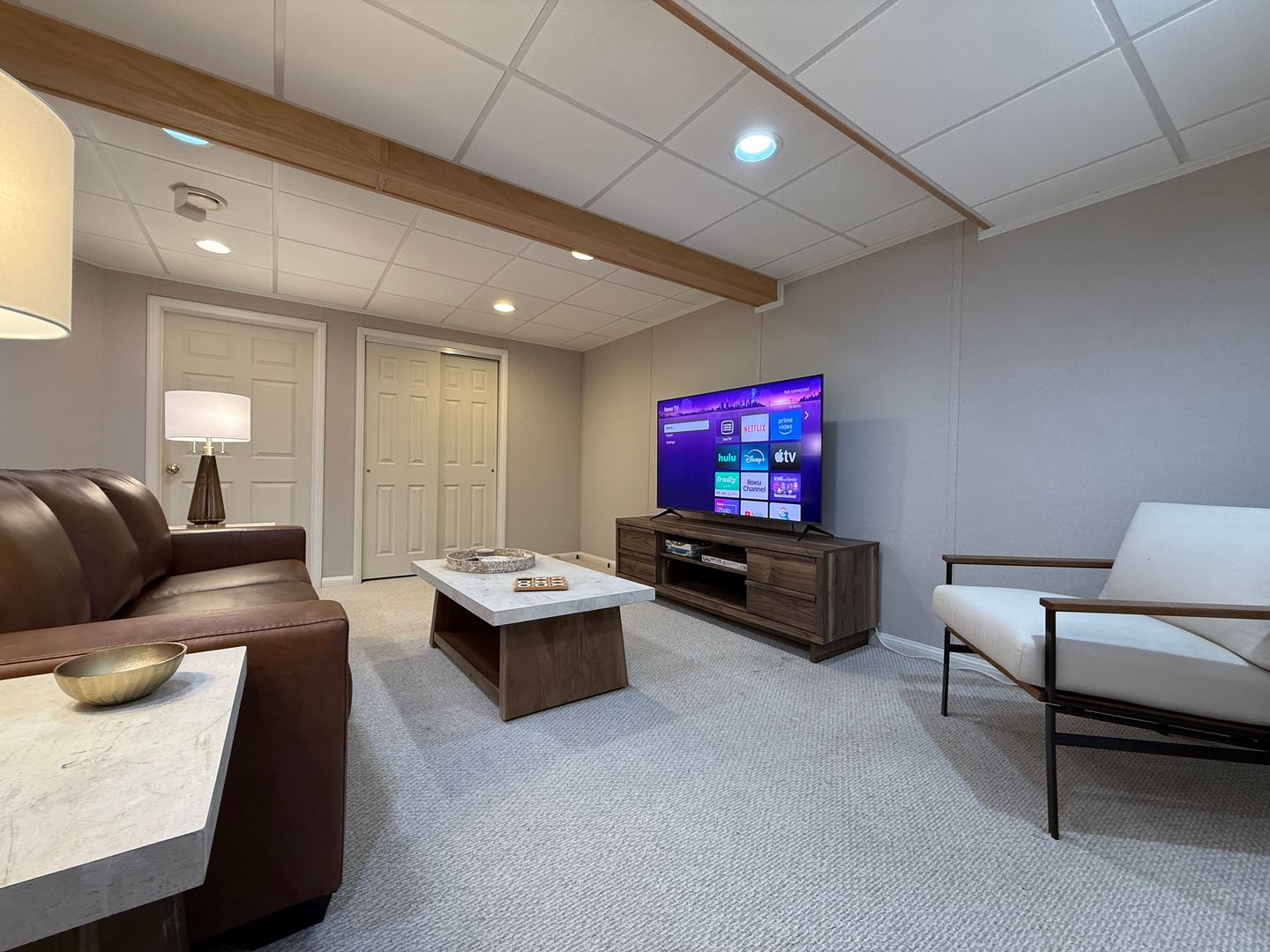 There is also a second living room area downstairs that features a queen sized fold out couch, 65" TV and plenty of cozy bedding.