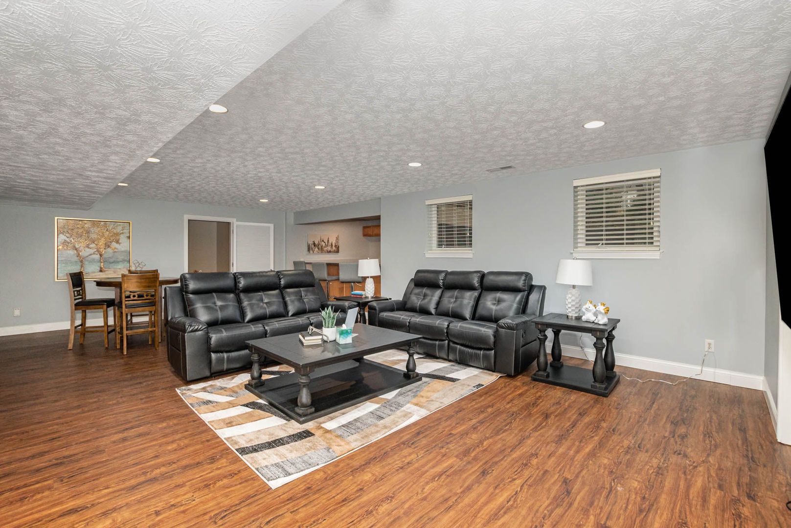 The space is grand with many different rooms. When you walk in the front door you should feel right at home! The living room offer super comfortable couches, a Roku TV and a ceiling fan, plus looks right into the spacious full kitchen. The hallway leads to a full size washer and dryer, a master bedroom with a Roku TV and ceiling fan. There are 4 bedrooms on the first floor. The basement is completely finished and features a rec area and 3 more bedrooms.