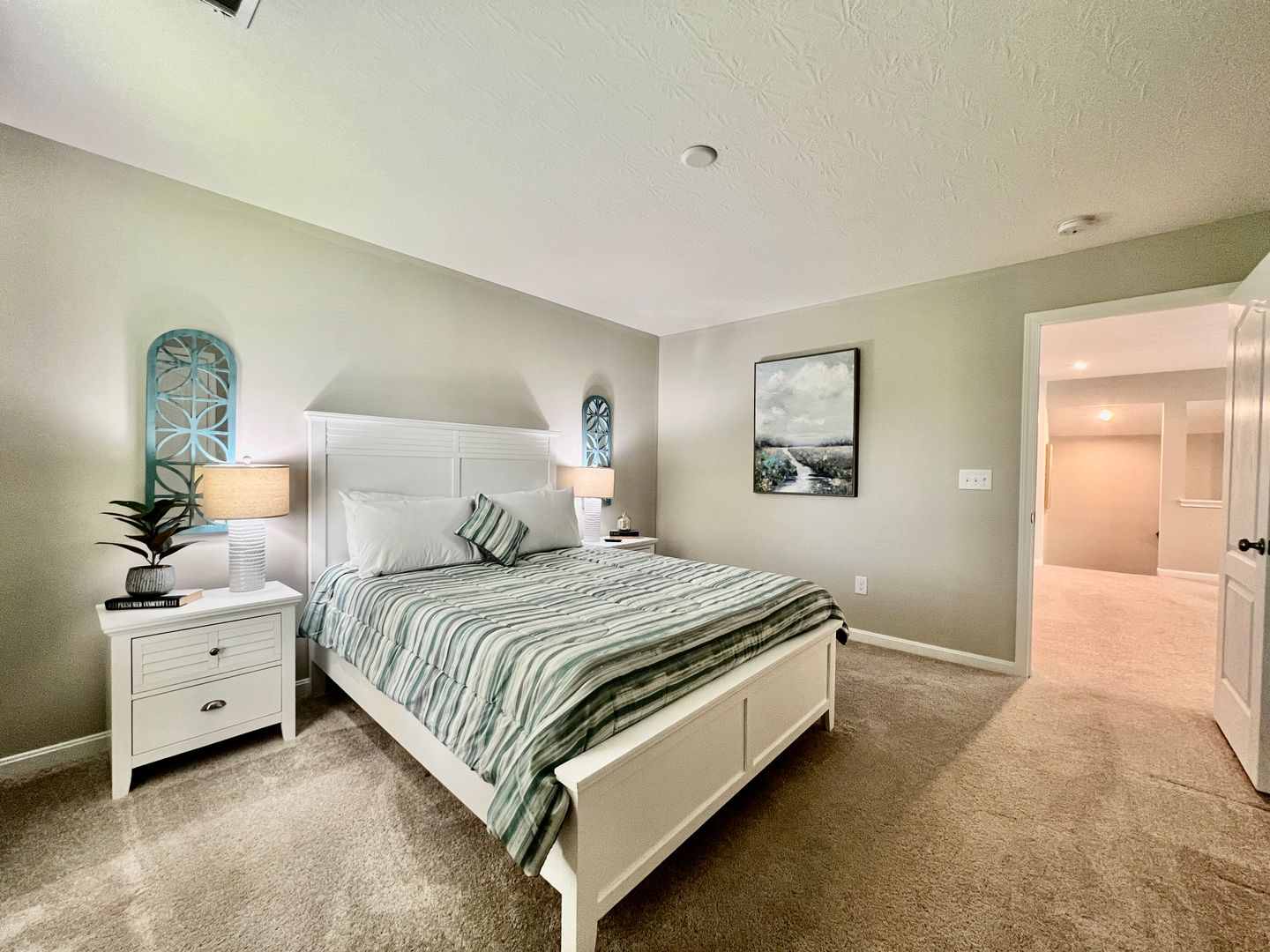 There are two bedrooms located on the second floor along with a full bathroom with a shower/tub combination. The queen bedroom has a dresser and closet. The king bedroom has a smart TV and closet.