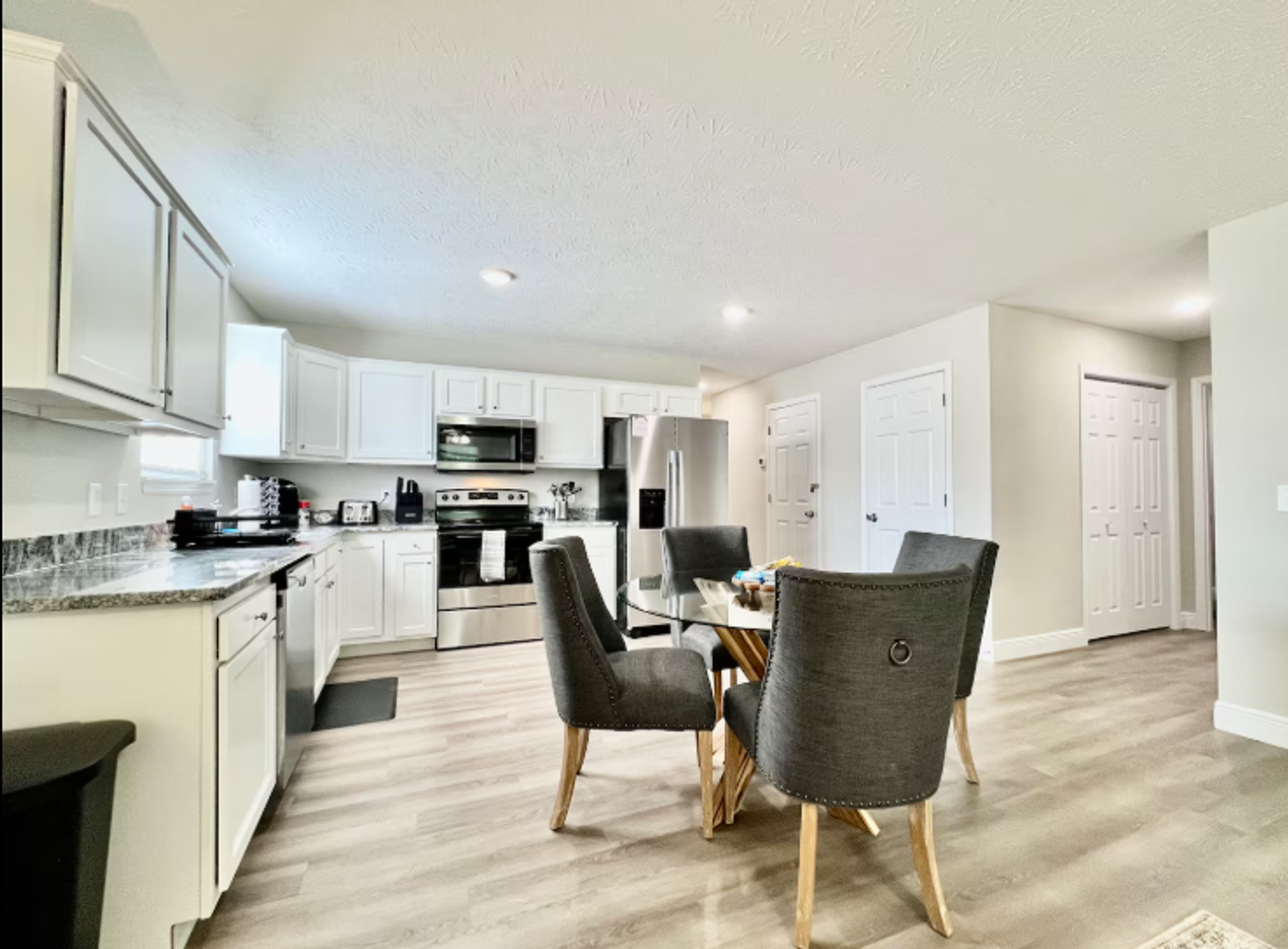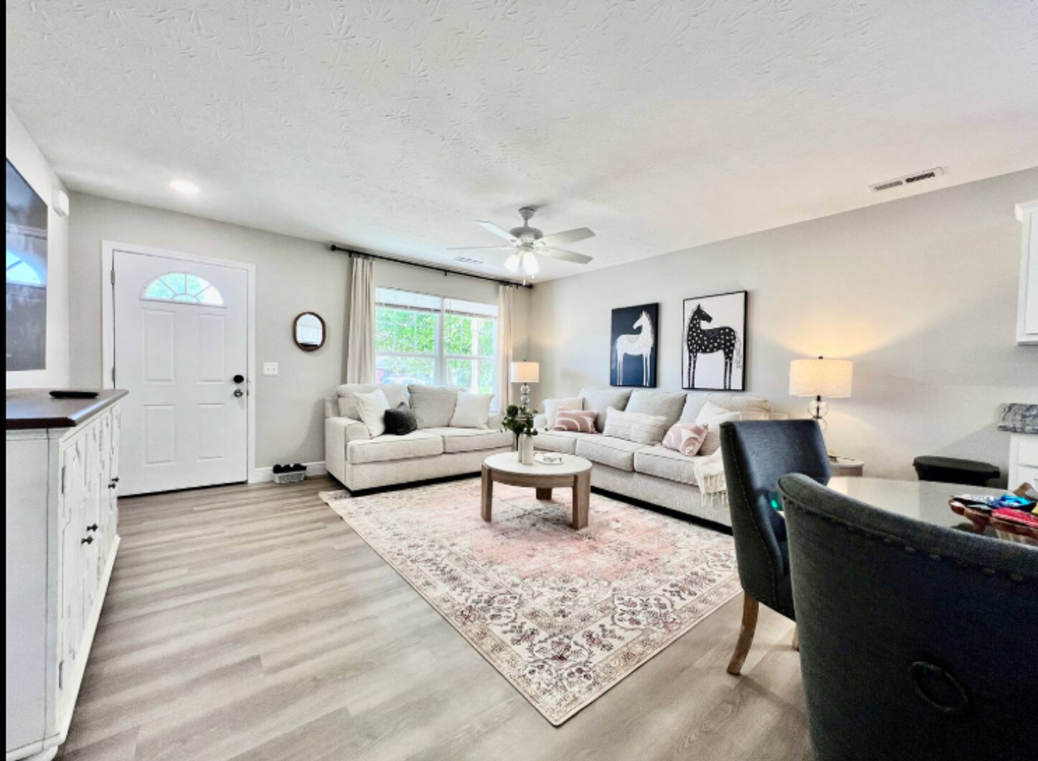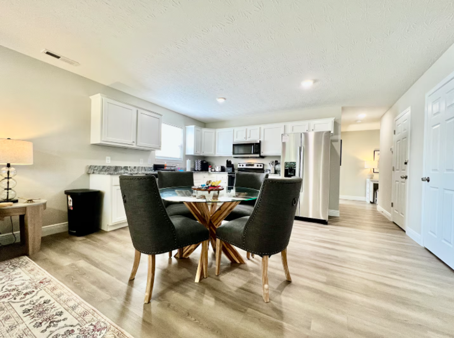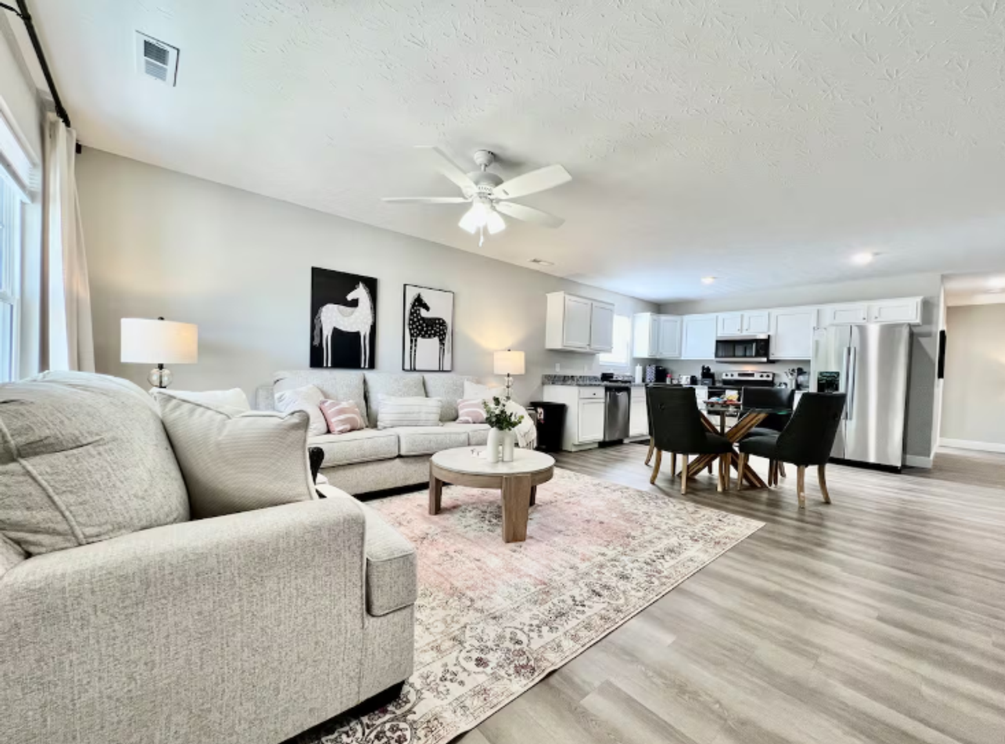 A blend of comfort, style, and convenience greets you as soon as you enter our newly built ranch home. While decorating this inviting retreat, we have worked hard to create a home away from home feeling for our guests. The open-concept floor plan in the living space allows room for many guests. Everyone in your group will have room to mingle and relax.