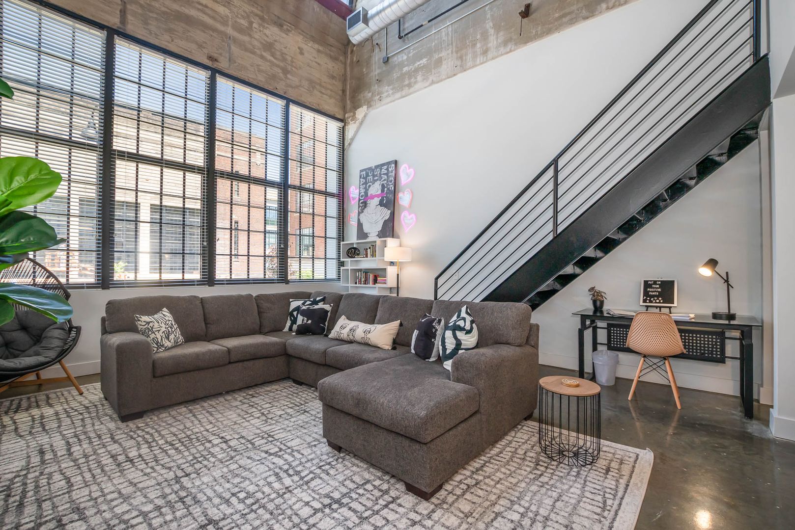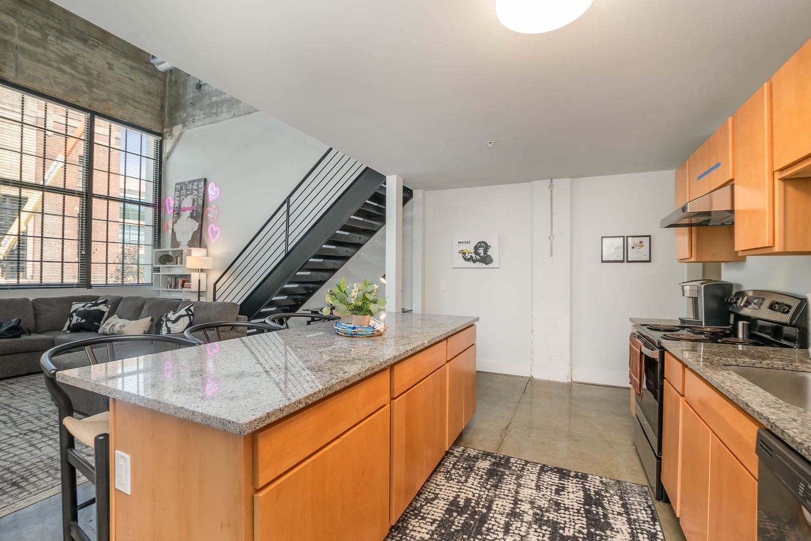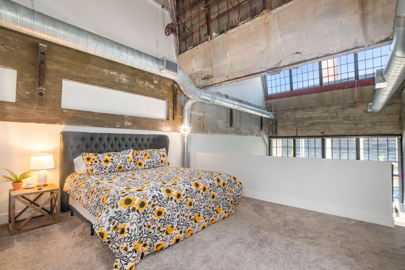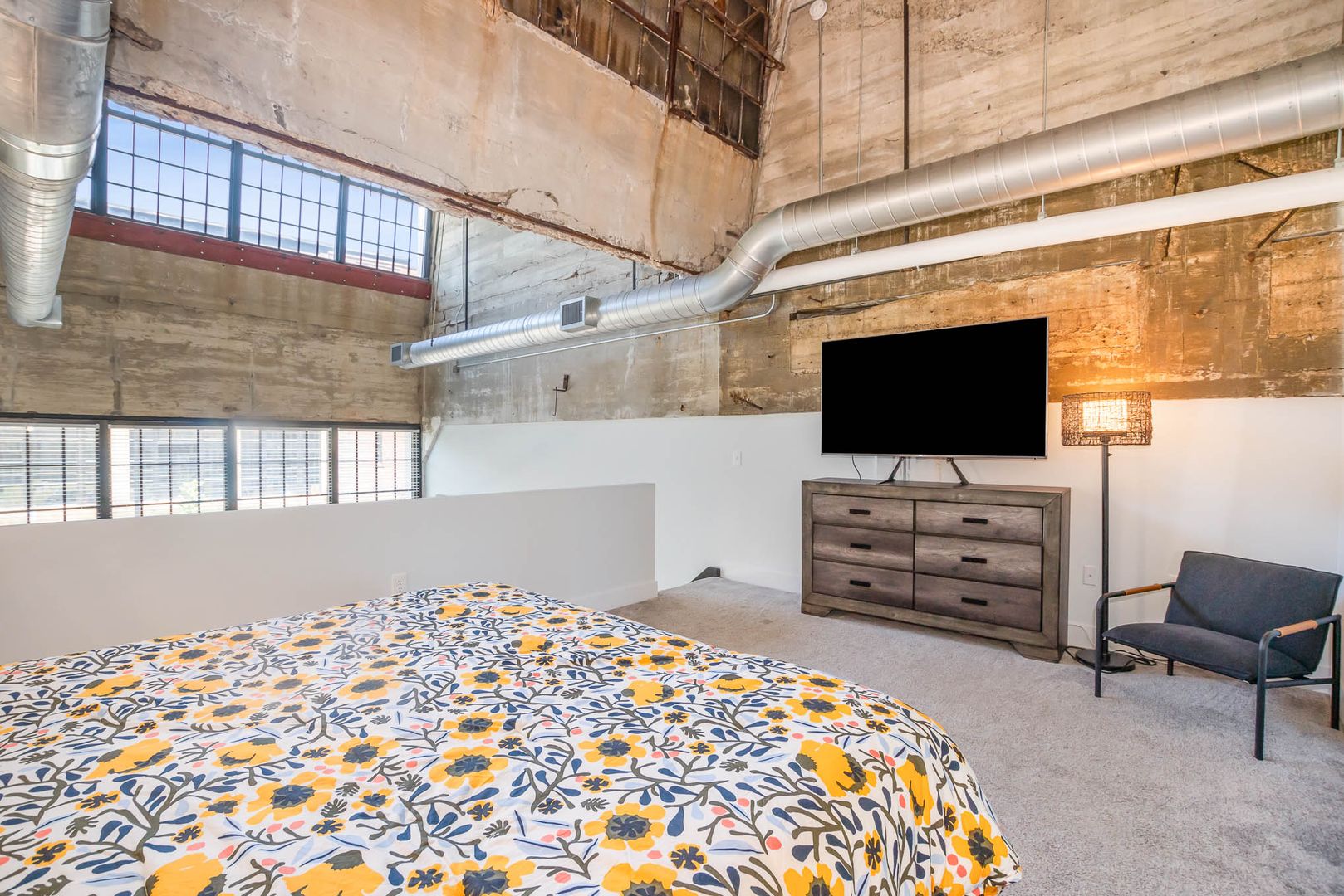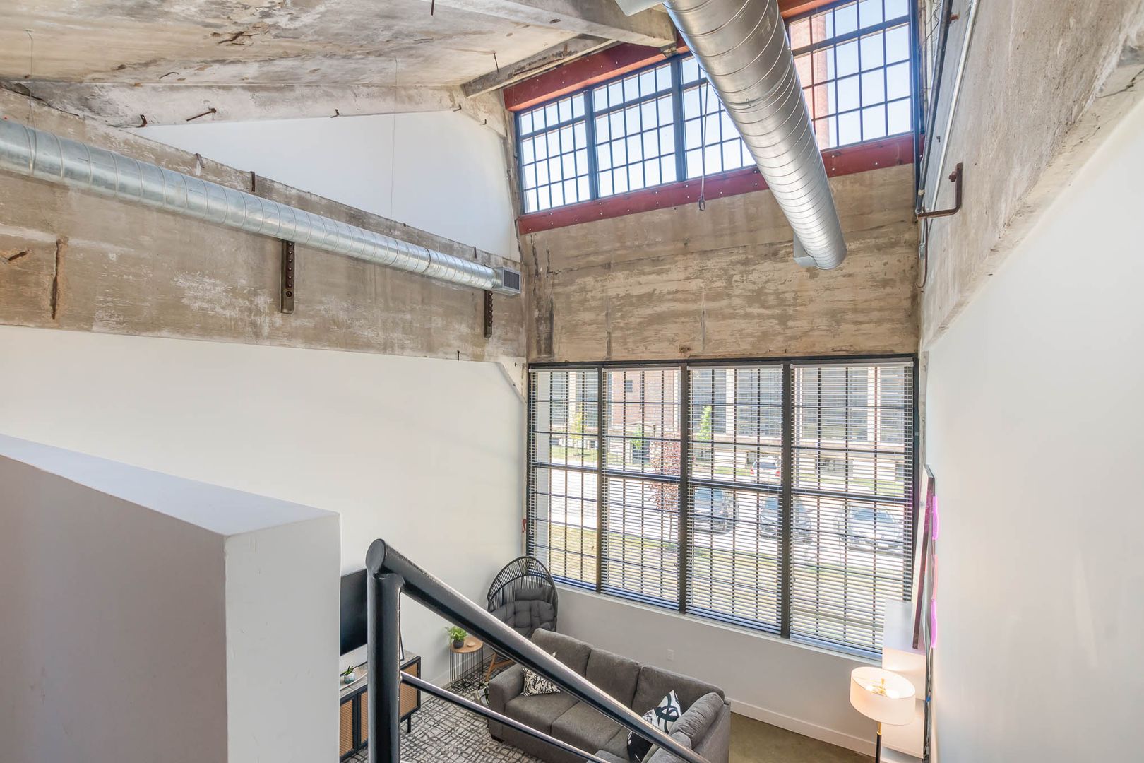 This gorgeous loft boasts an industrial feel complete with exposed duct work, large picturesque windows, and concrete flooring throughout the bottom level. There is a bit of history and character everywhere you look.