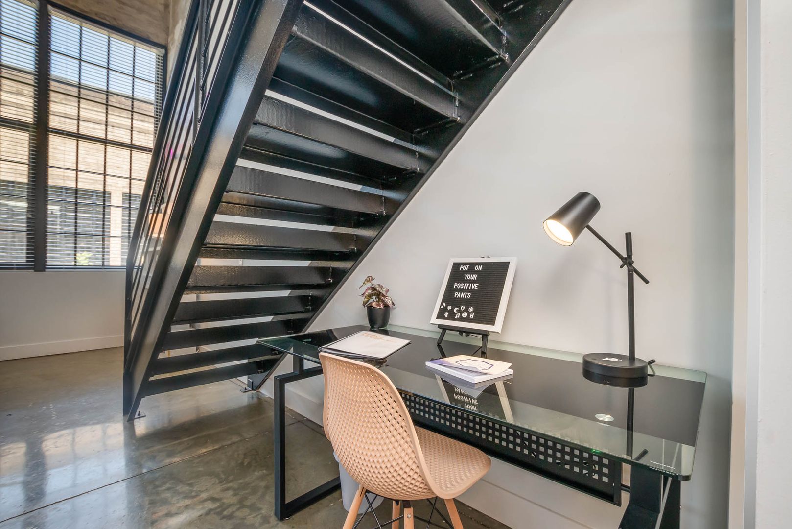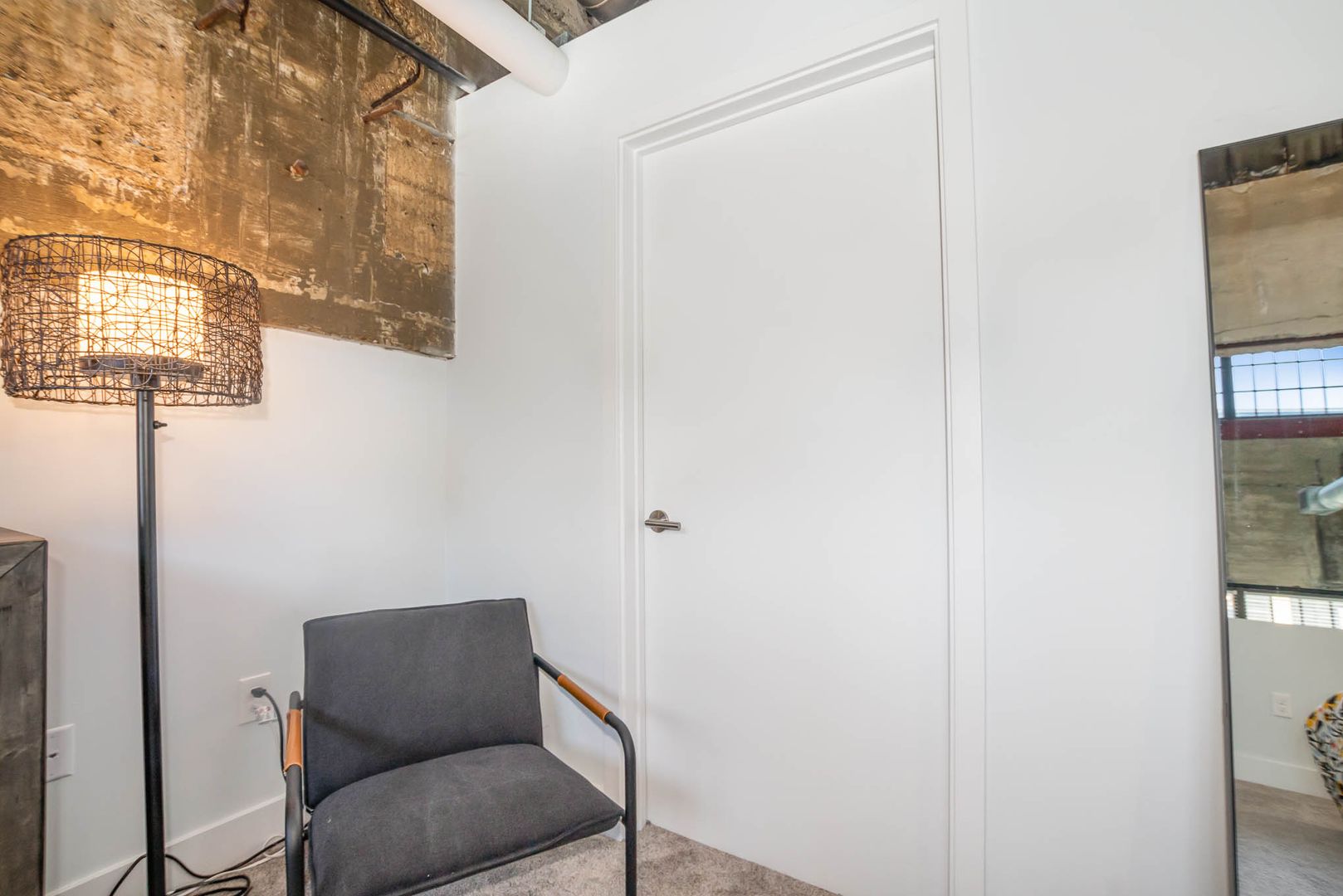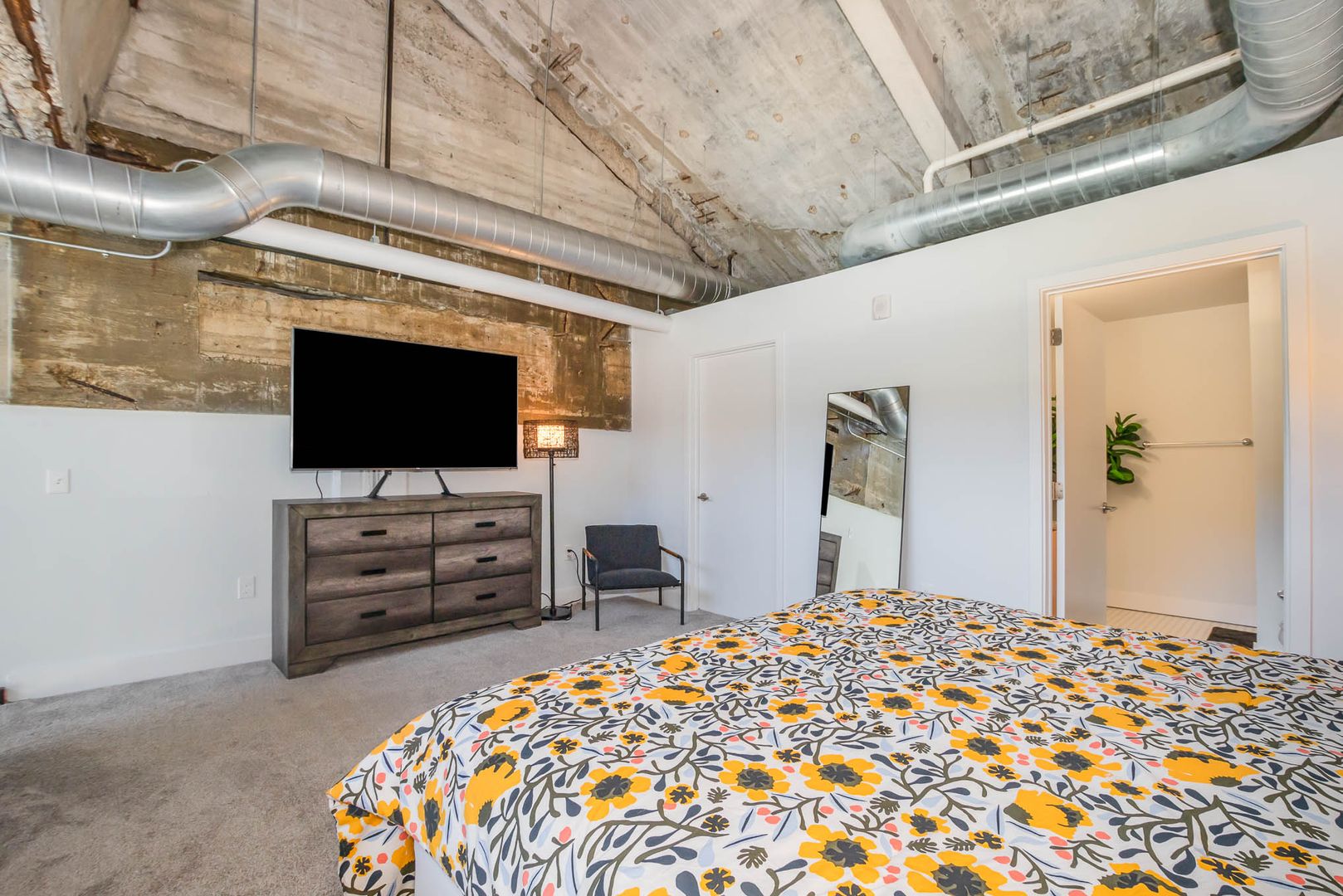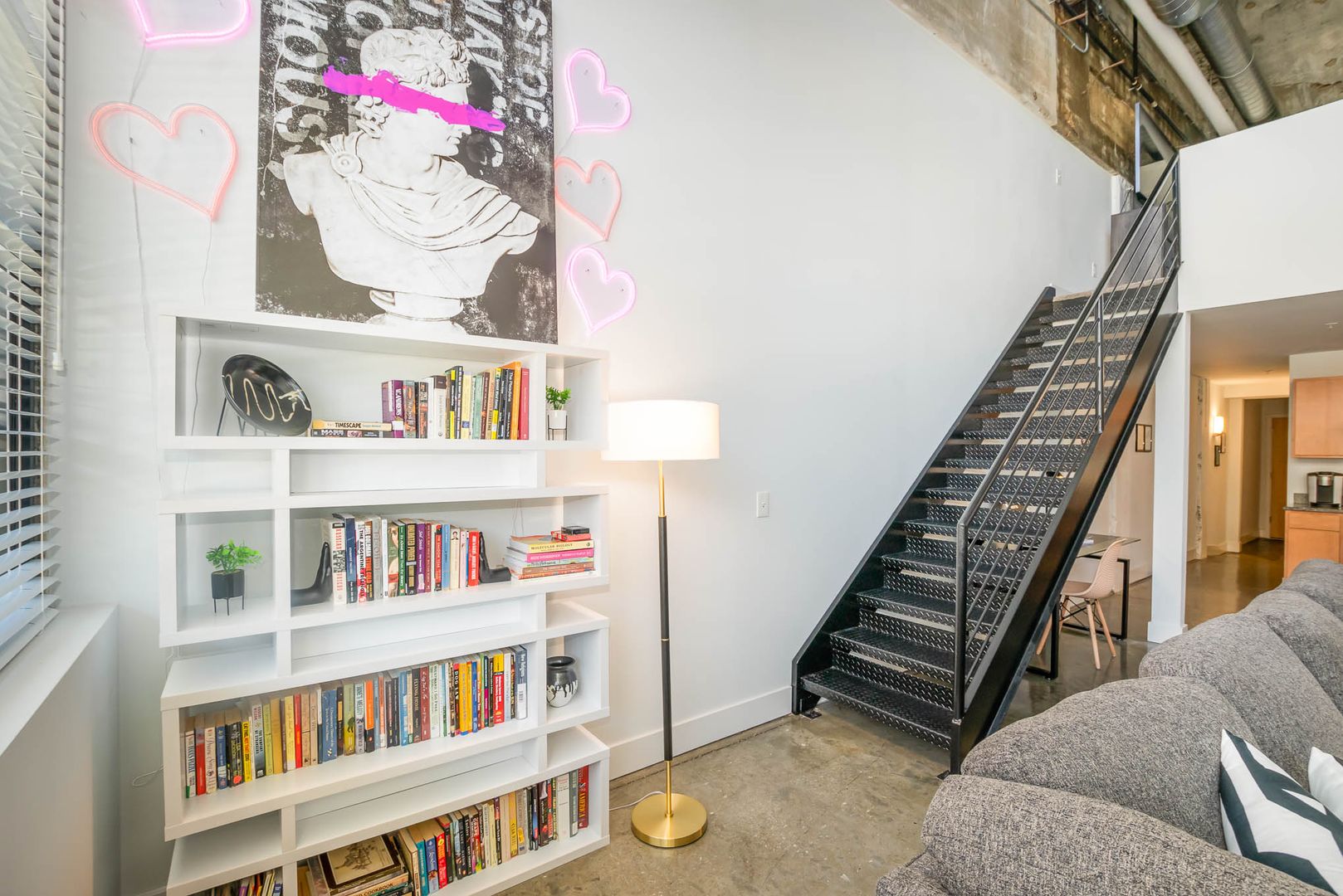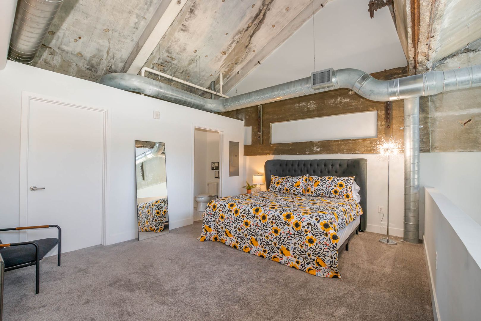 This gorgeous loft boasts an industrial feel complete with exposed duct work, large picturesque windows, and concrete flooring throughout the bottom level. There is a bit of history and character everywhere you look.