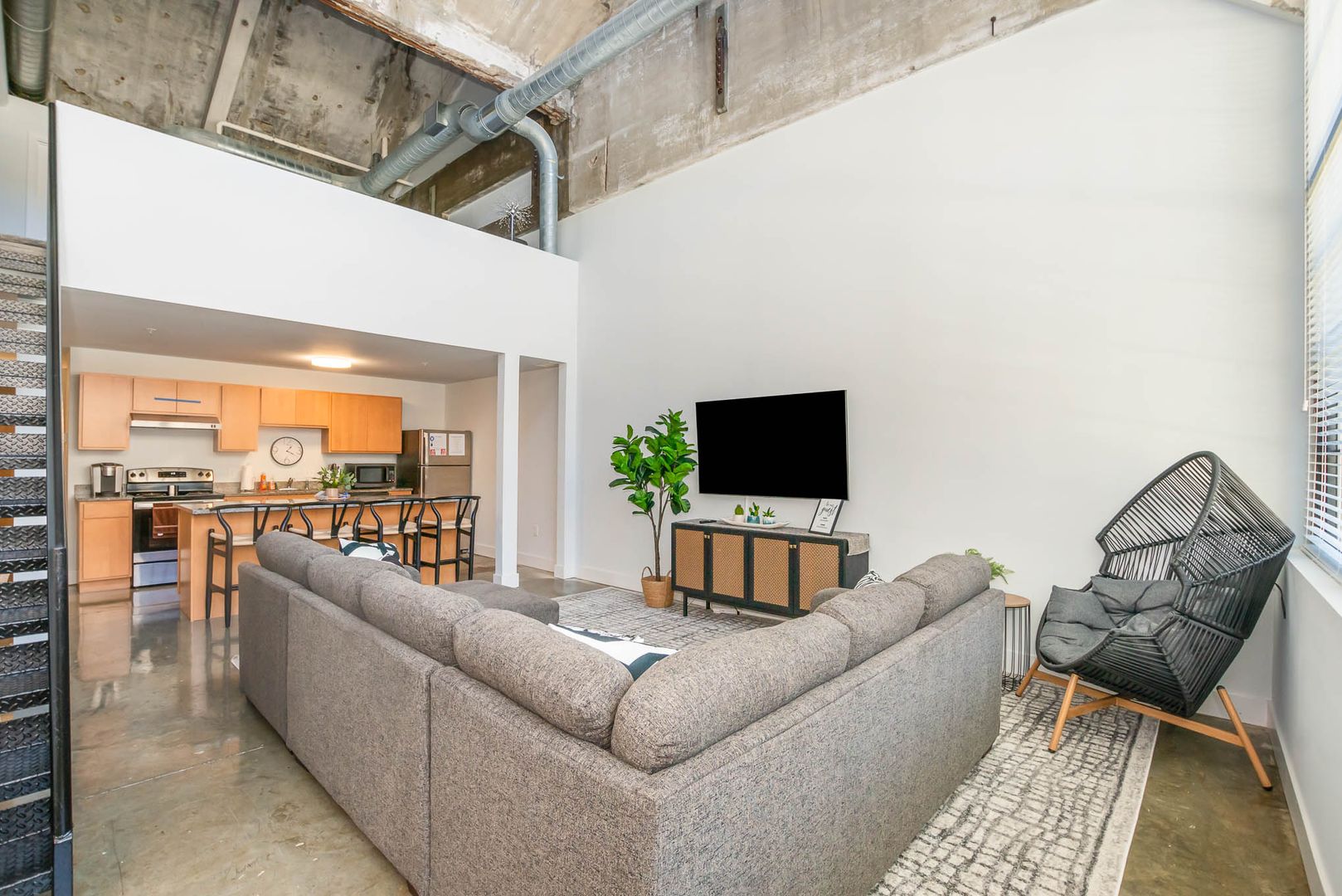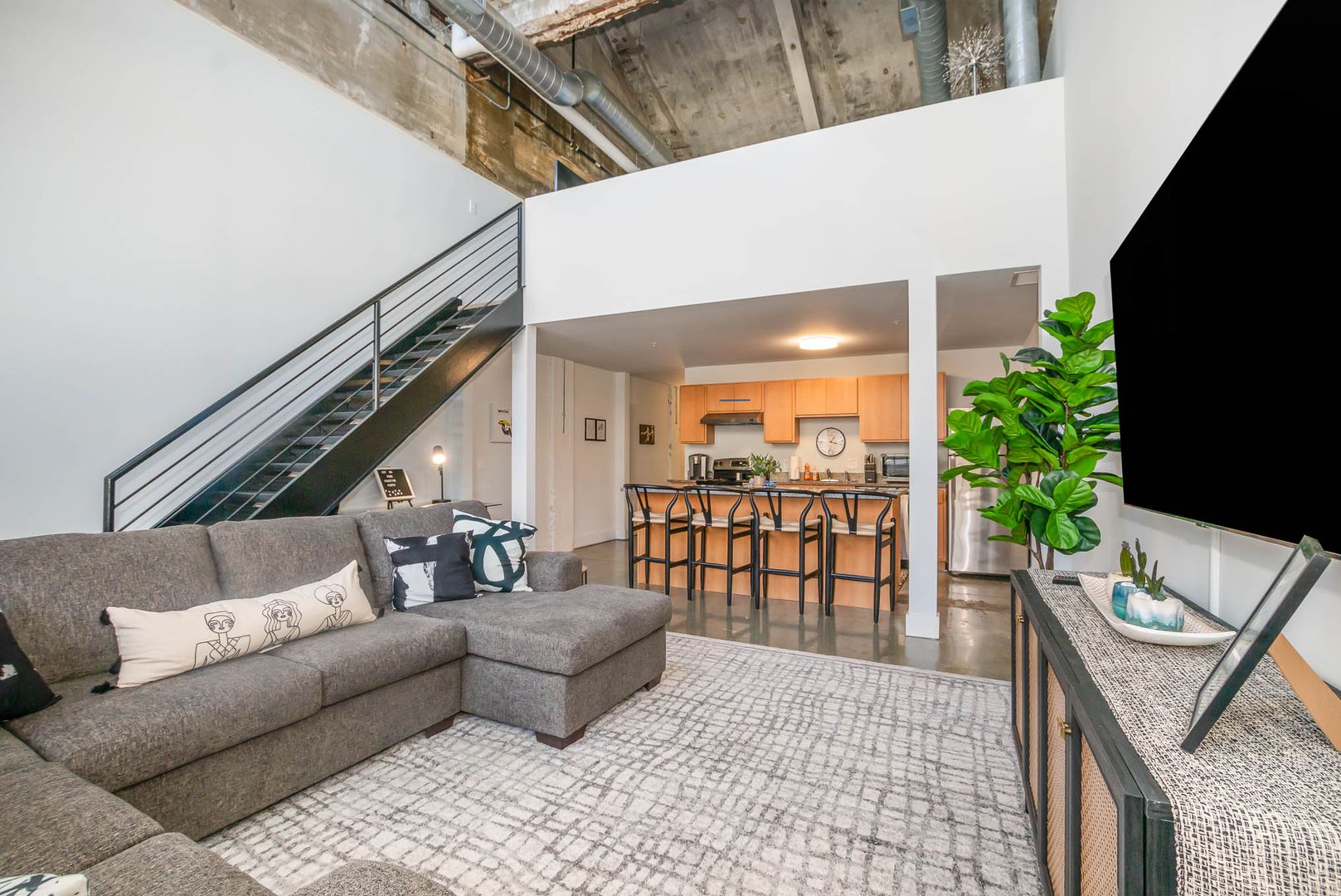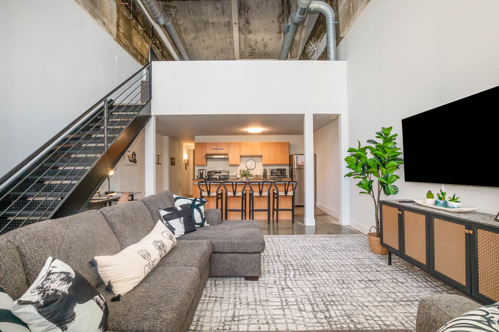 The inside of your loft features an open-concept floor plan with a massive 13-foot ceiling. Enjoy chatting with your guests from anywhere in the main living area.