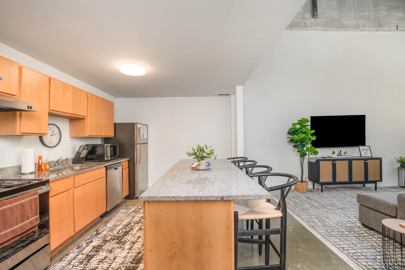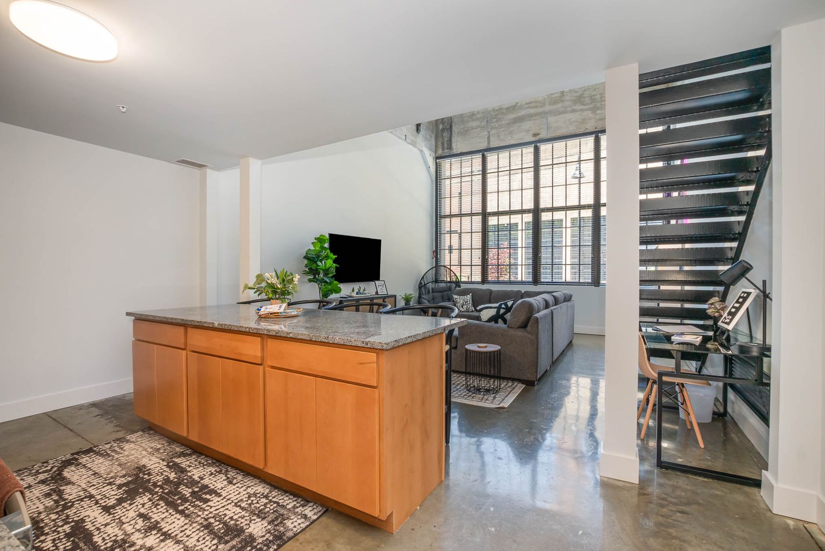 The kitchen and living room are open-concept. You have plenty of space and the expansive windows make this room feel very large. A comfortable couch, ROKU TV, and a dedicated workspace make this space very versatile.