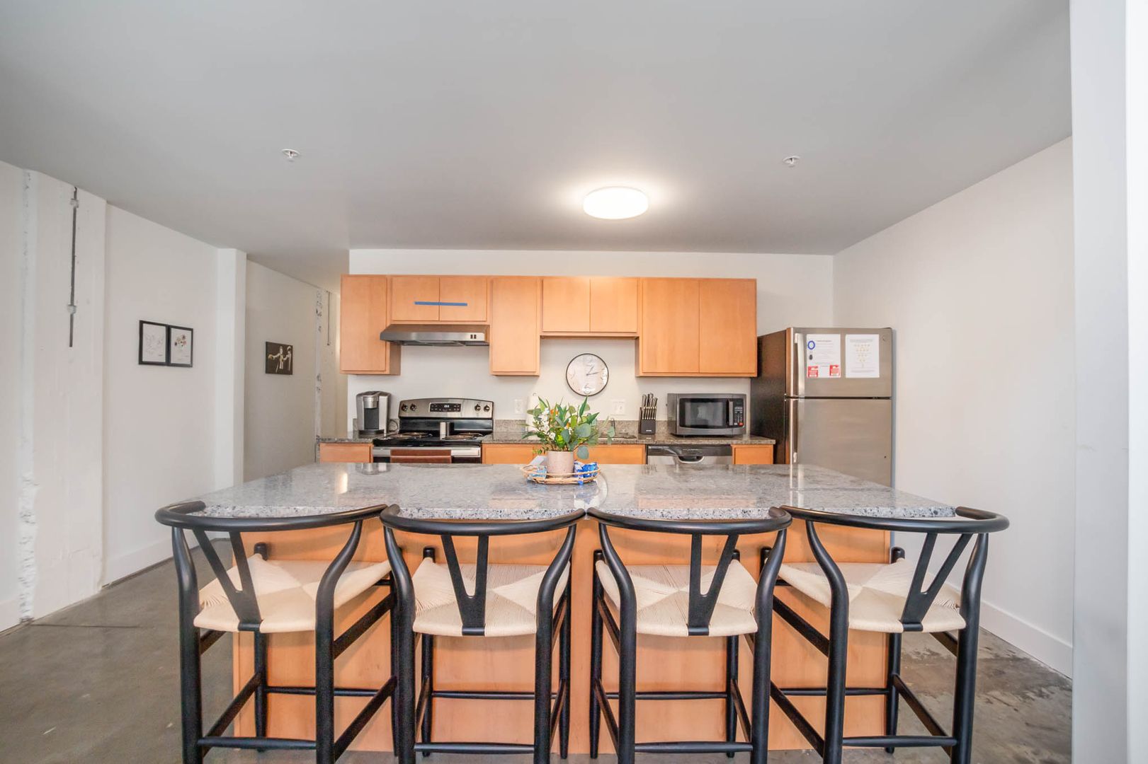 Full kitchen with brand new appliances, including a Keurig and coffee pods. Four barstools make it easy to eat at the kitchen island as your chef whips up your nightly meals.