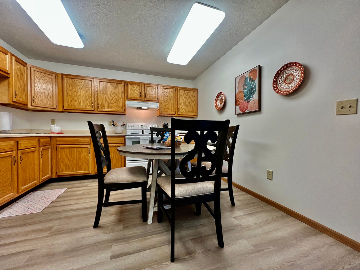 The living room is semi-open to the kitchen and dining space. The kitchen is smaller, but it comes fully furnished with everything you will need to cook basic meals during your stay. There is a Keurig coffee maker with extra coffee pods that you can use during your stay. There is a kitchen table with seating for four.