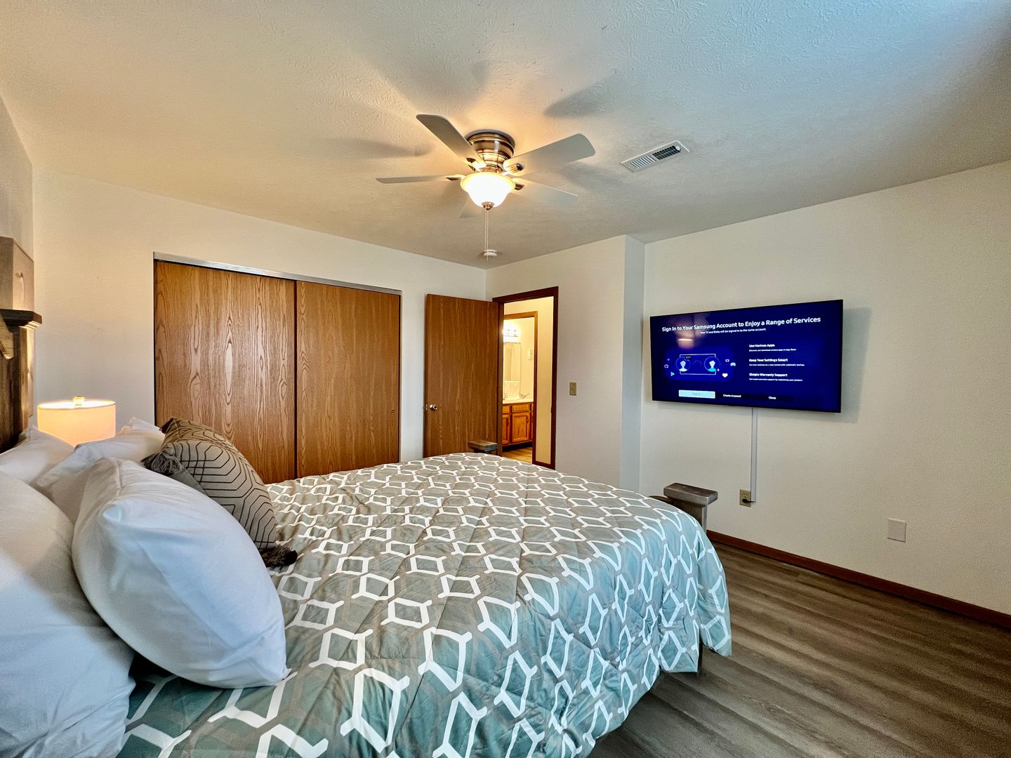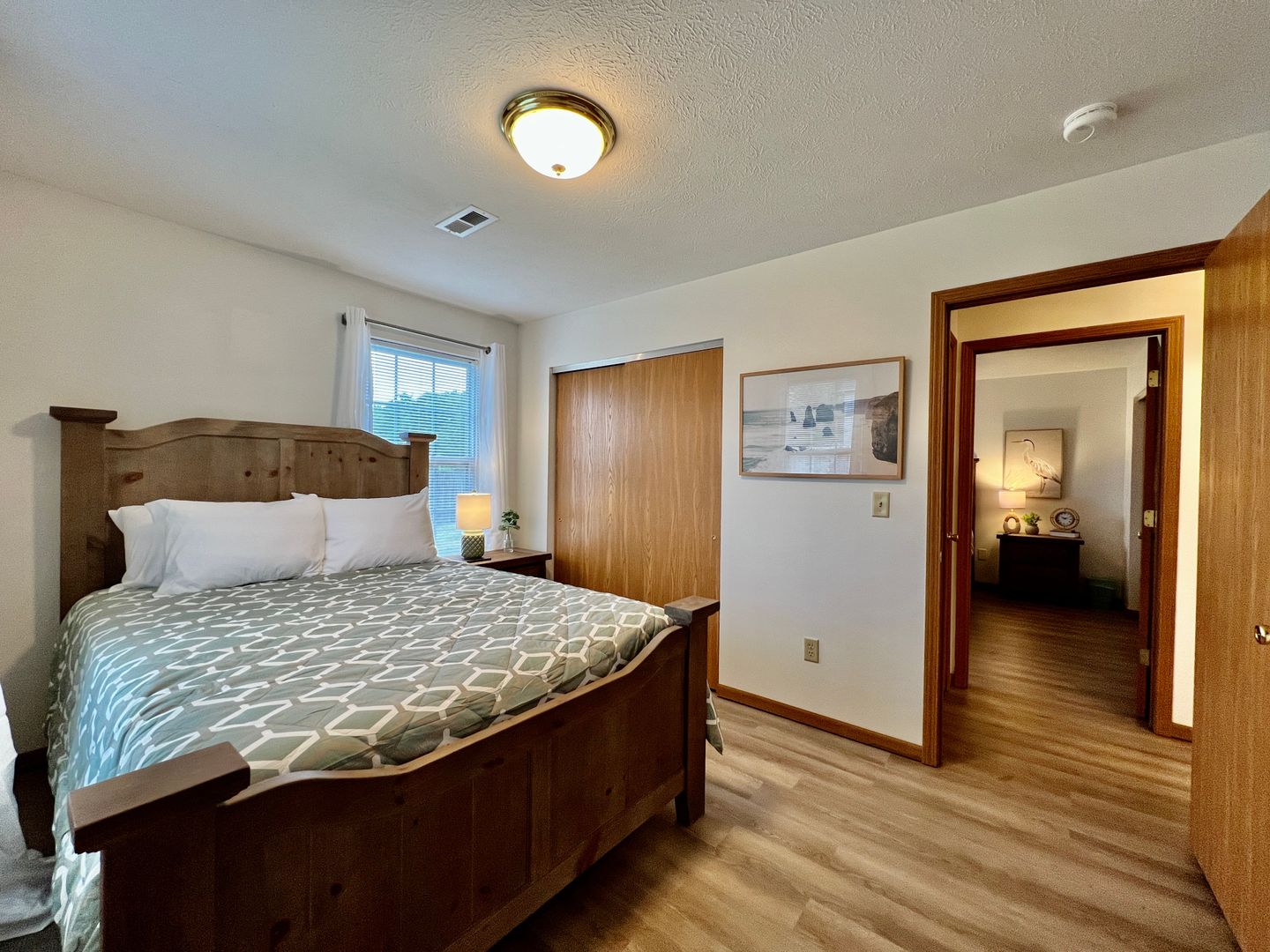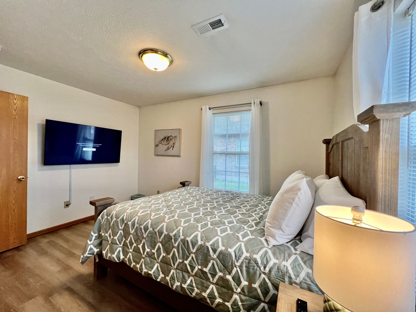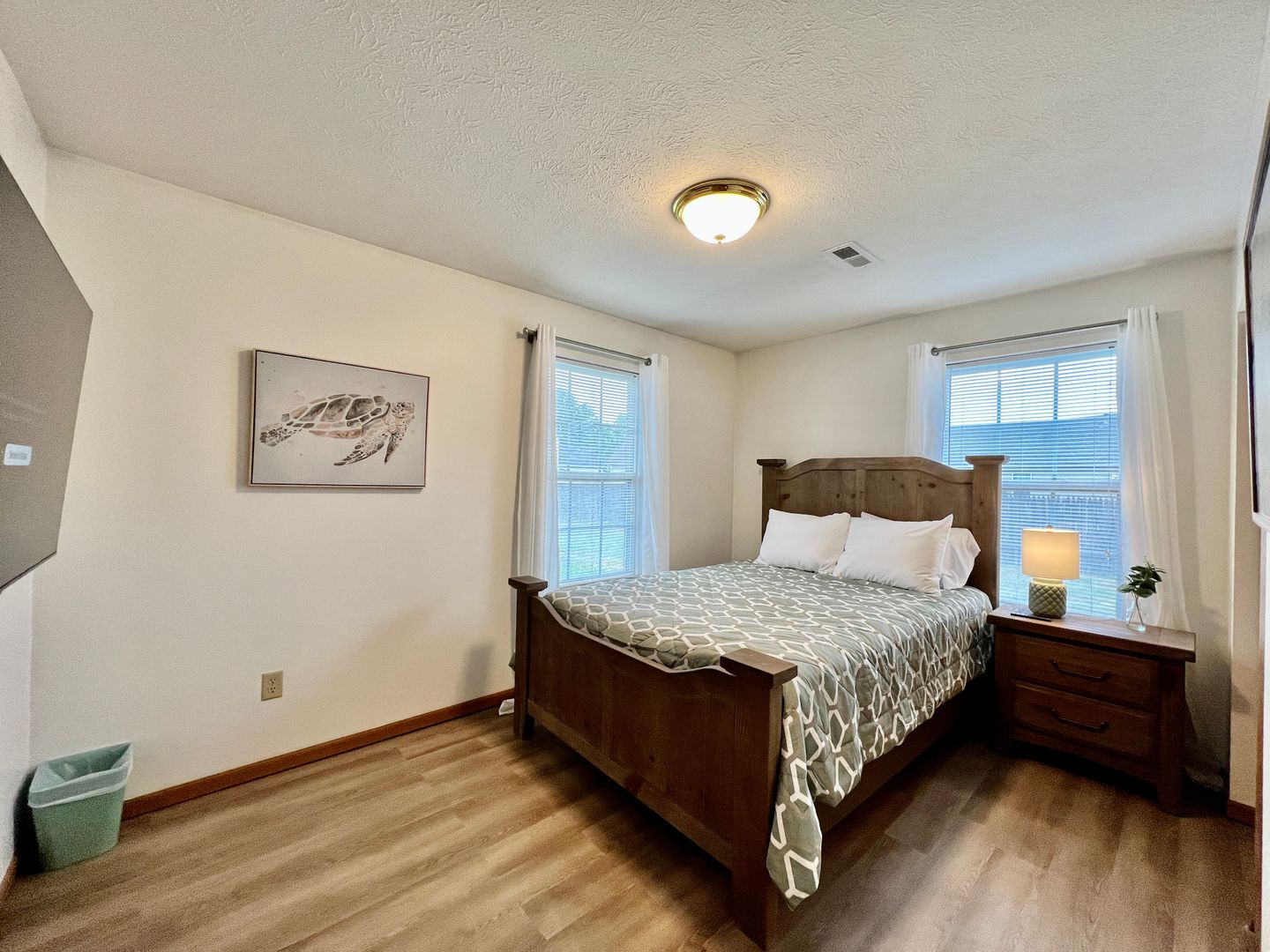 This home has two bedrooms. Both bedrooms have a large flat-screen TV, a closet, and dressers if you wish to unpack. Our guests love how cozy our mattresses are in the bedrooms. This home has two queen-sized bedrooms.