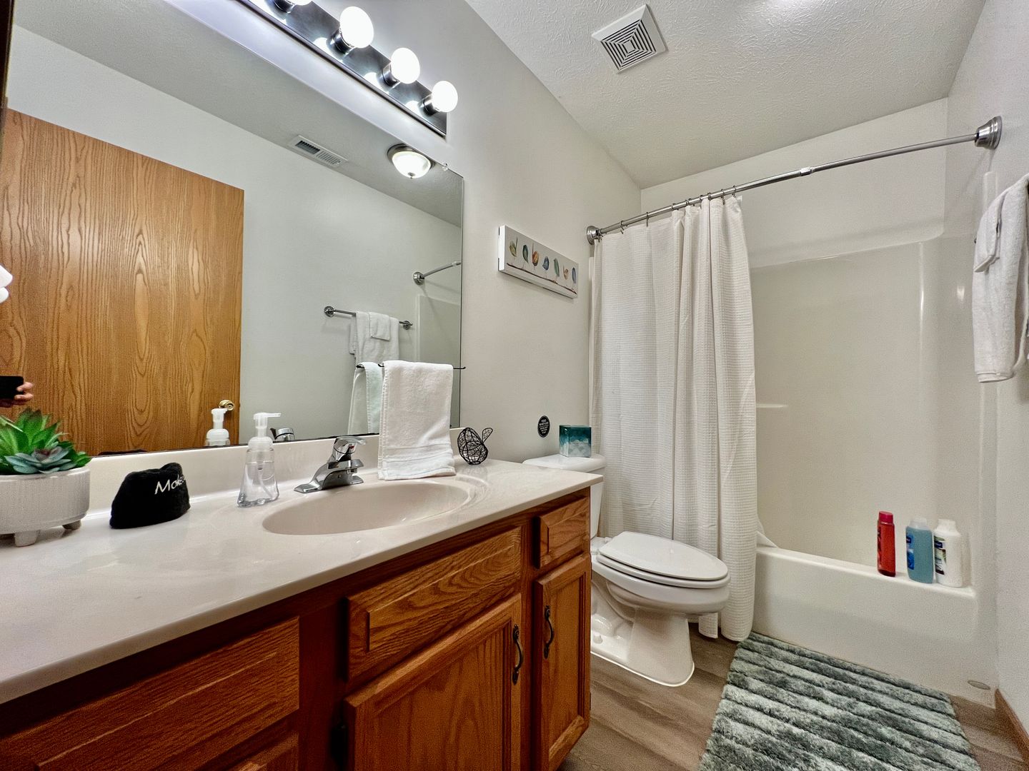 There is one full-size bathroom that is shared between the bedrooms and living space. The bathroom features a tub/shower combination and under-the-sink storage. We provide towels and basic consumable toiletries that you are welcome to use throughout your stay.