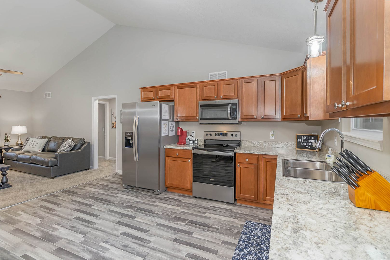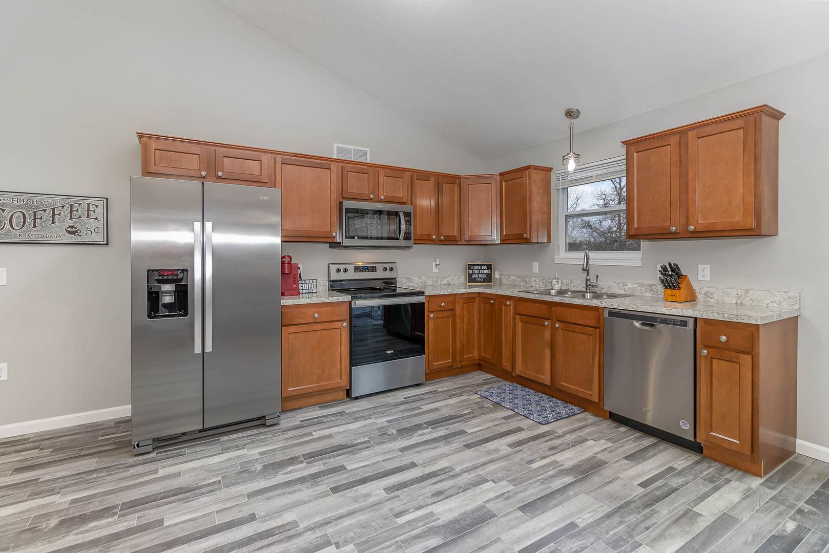 A blend of comfort, style, and convenience greets you as soon as you enter our newly built ranch home. While decorating this inviting retreat, we have worked hard to create a home away from home feeling for our guests. The open-concept floor plan in the living space allows room for many guests. Everyone in your group will have room to mingle and relax.
