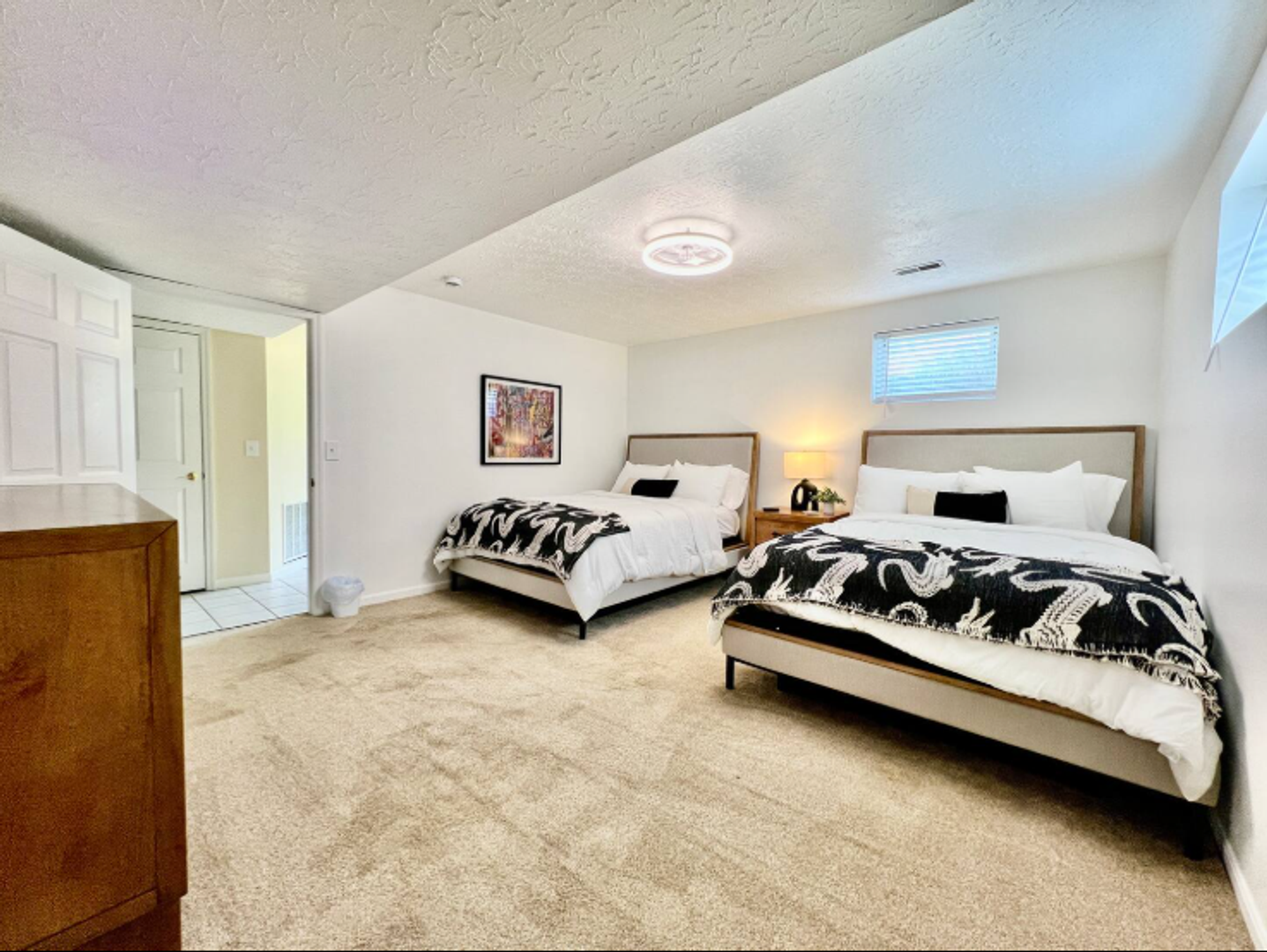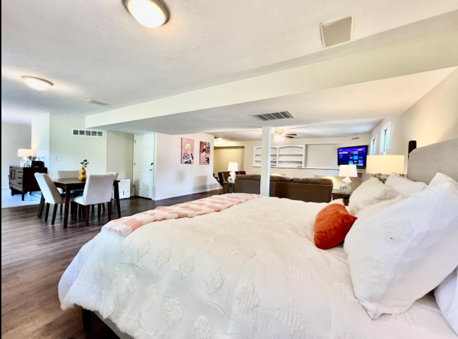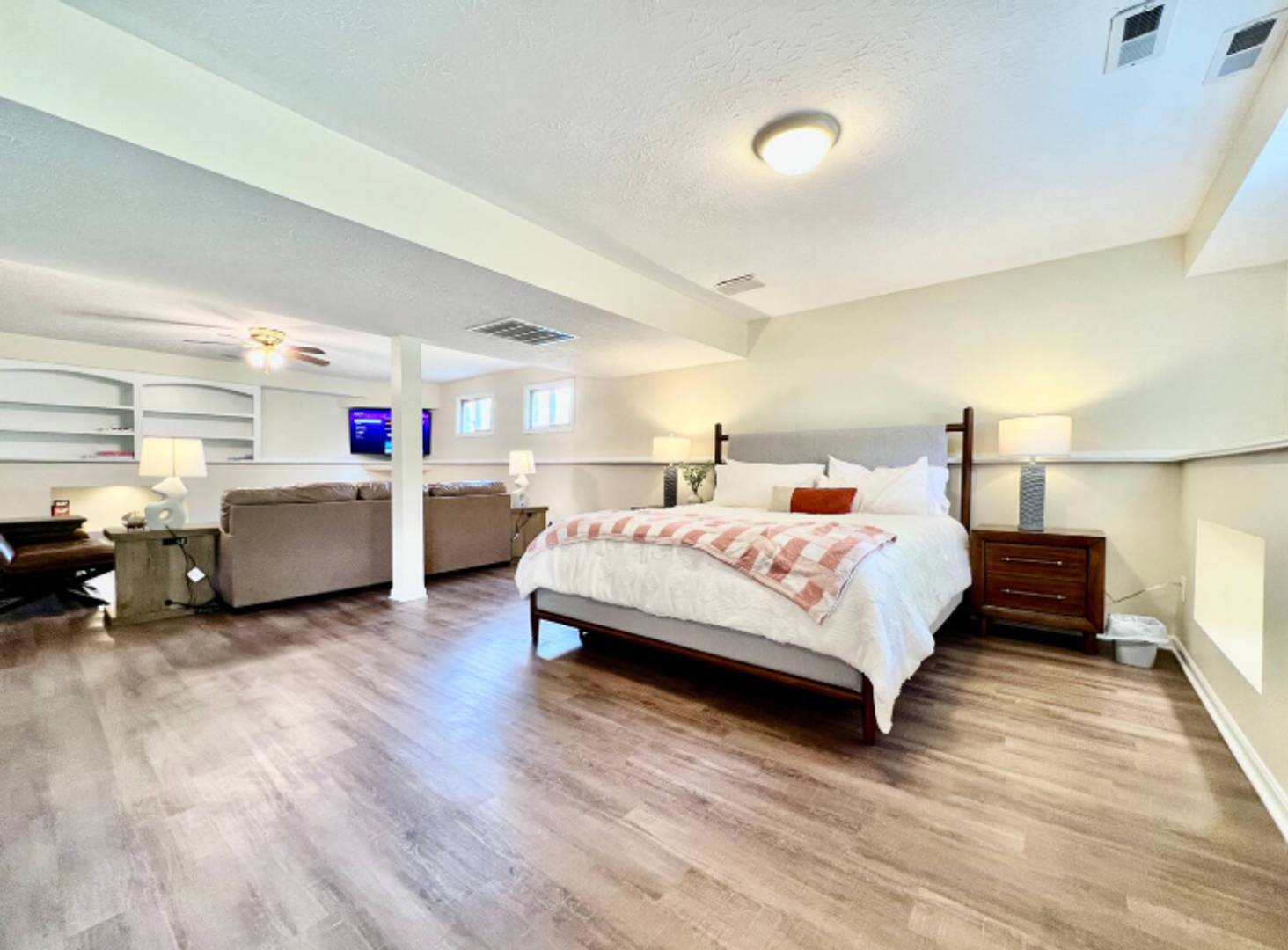 There is another King-size bedroom on the lower level that shares the open living space. Considered more of an in-law suite, this room shares with a full second kitchen and dining area, as well as a second living room.