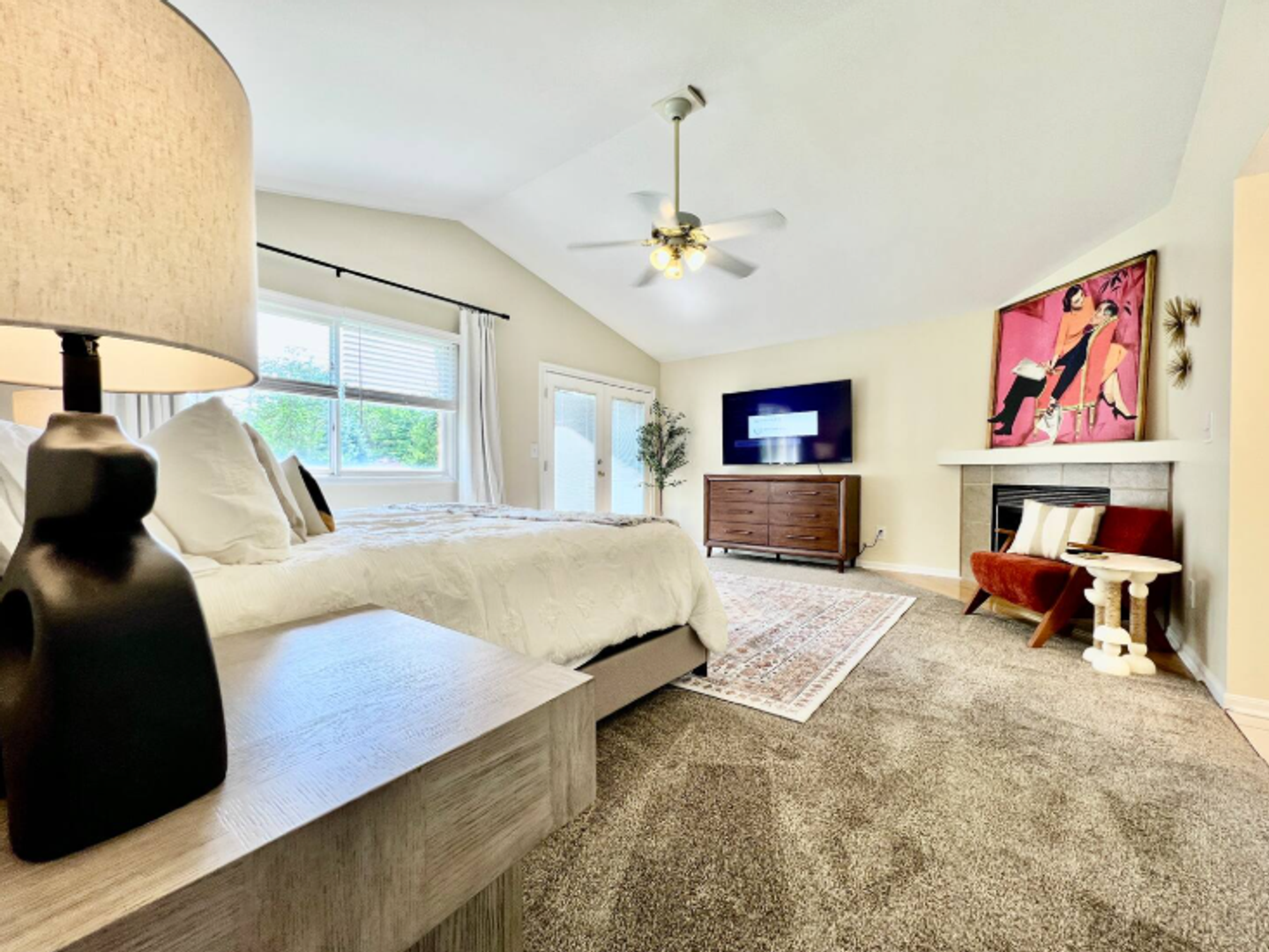 There are five cozy bedrooms in this house. The master bedrom features a king-size bed and is a full en suite bath, with tons of storage space for unpacking and accommodating longer stays. It also has a fireplace and a large flatscreen TV.