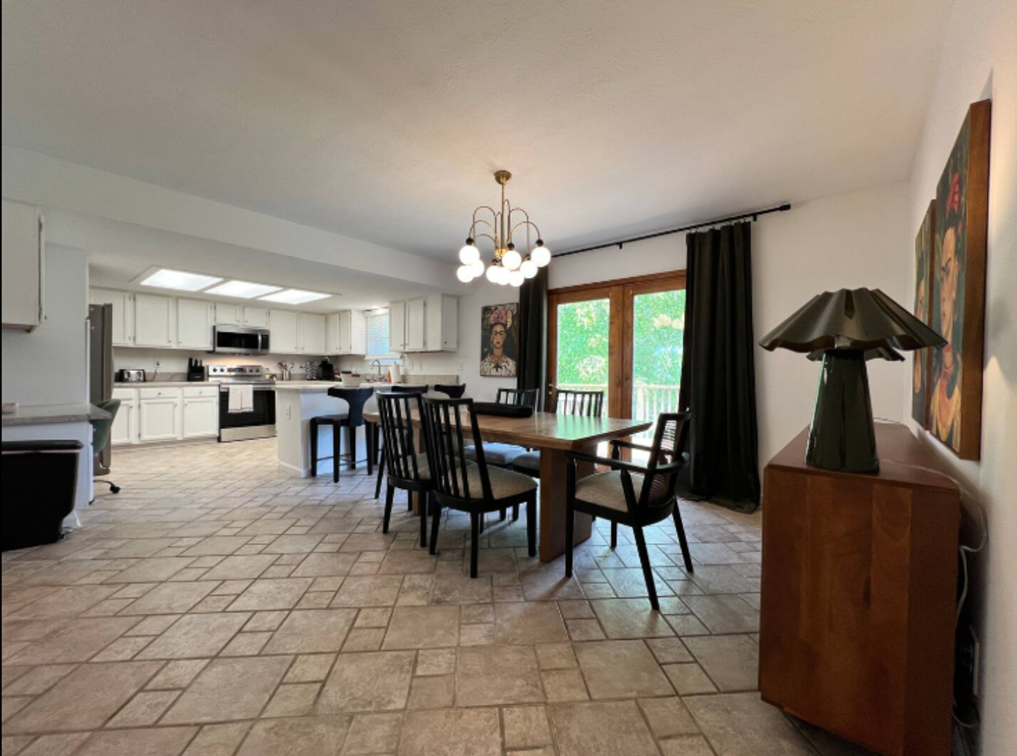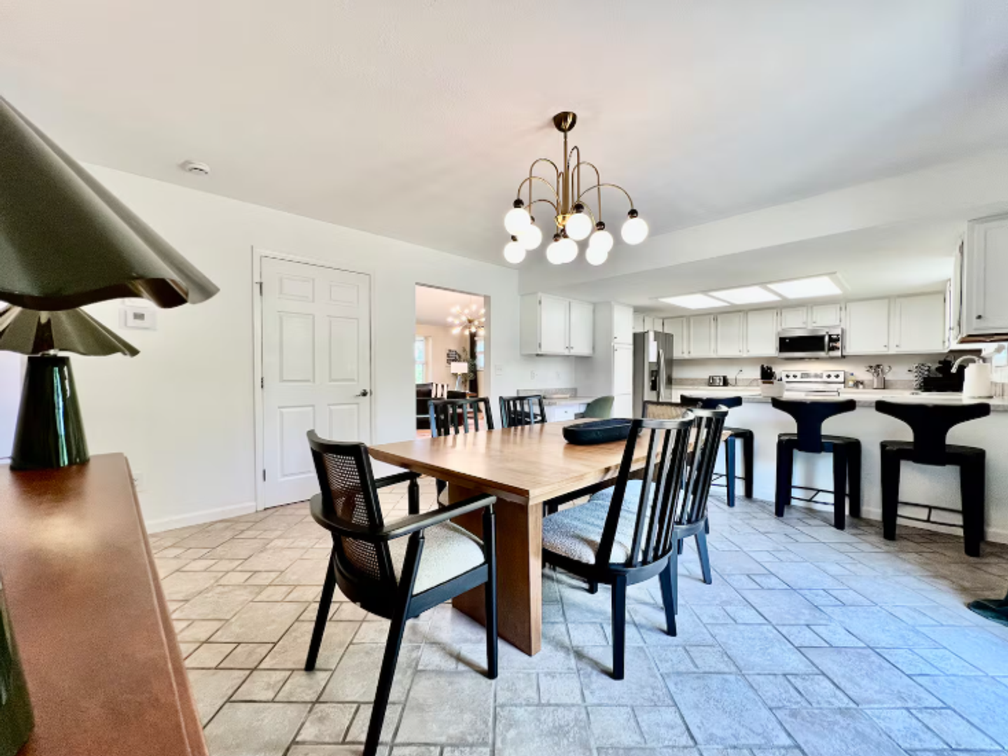 Just behind the living room, you will see the dining room. The table can seat six adults with three additional bar stools in the kitchen.