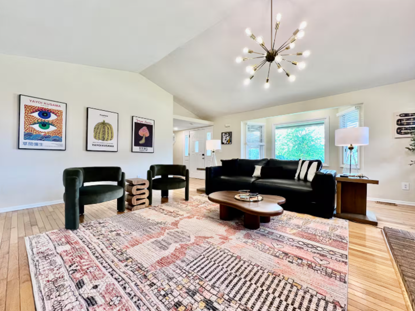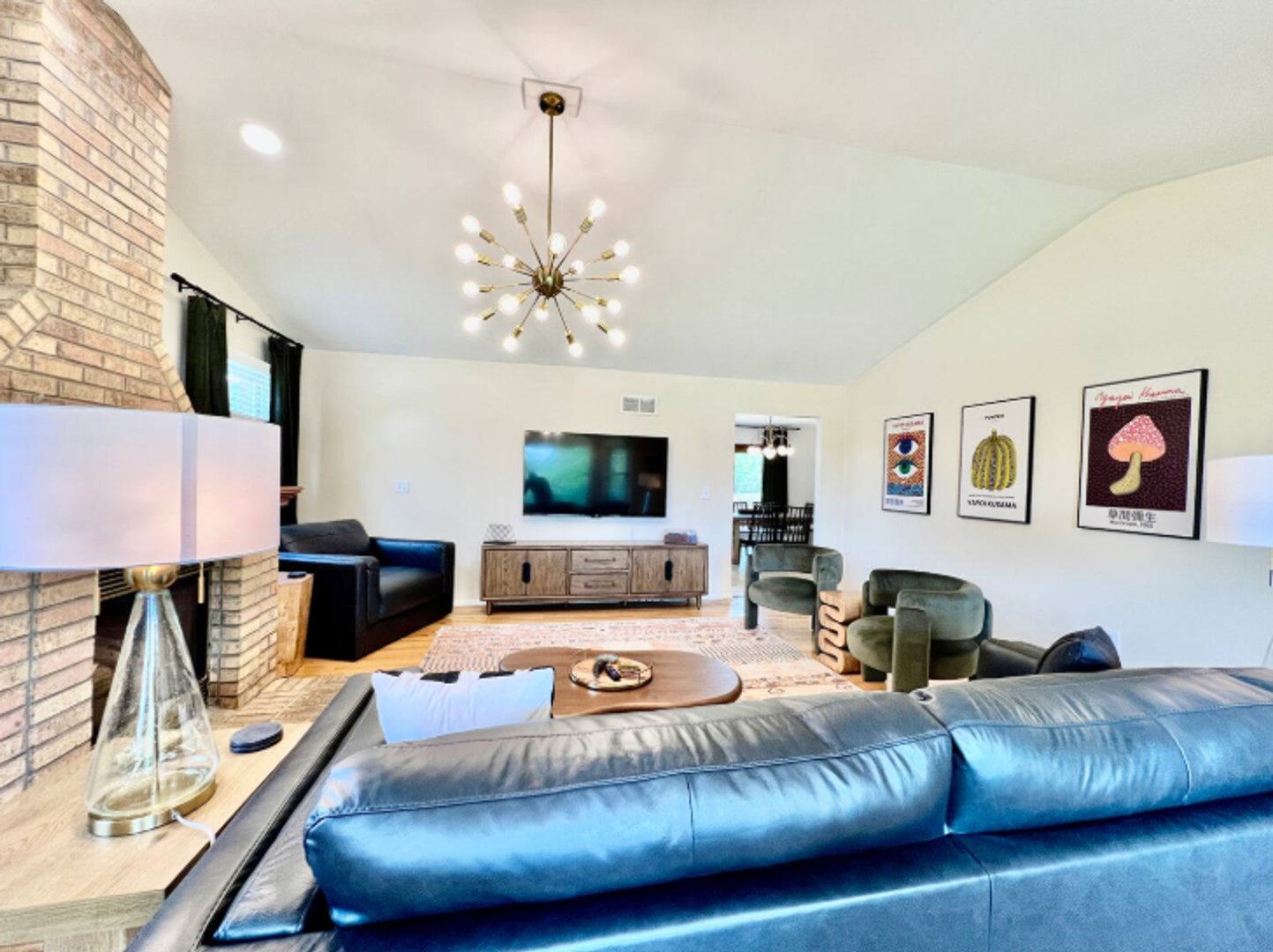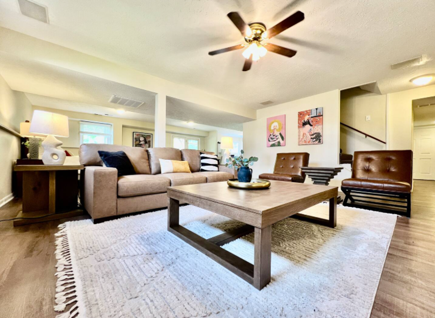 The living room is open to the kitchen and dining room area. It has natural light that flows through the windows. Cozy up on the sofas or armchair and watch your favorite movie or show on your large, flat-screen Roku TV.