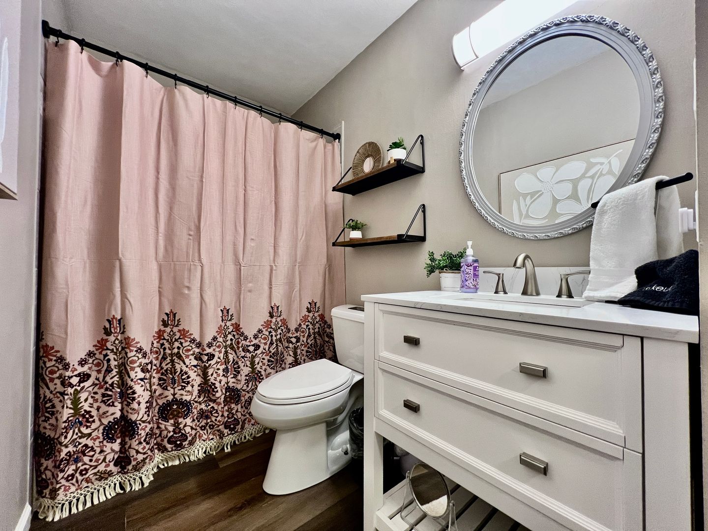 A full bathroom caters to efficiently accommodate all bedrooms.