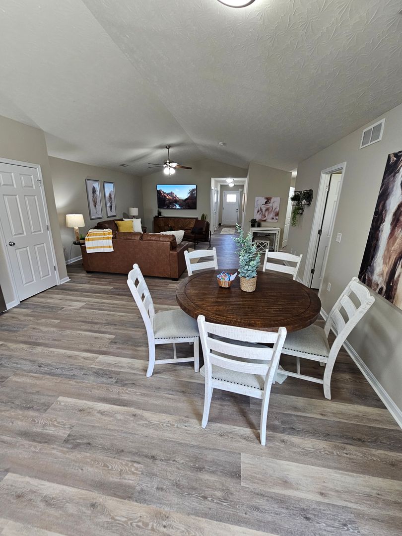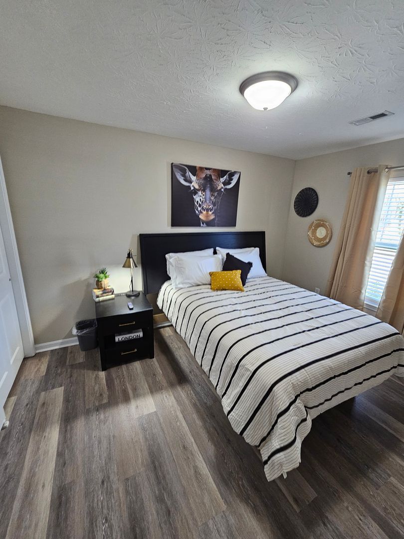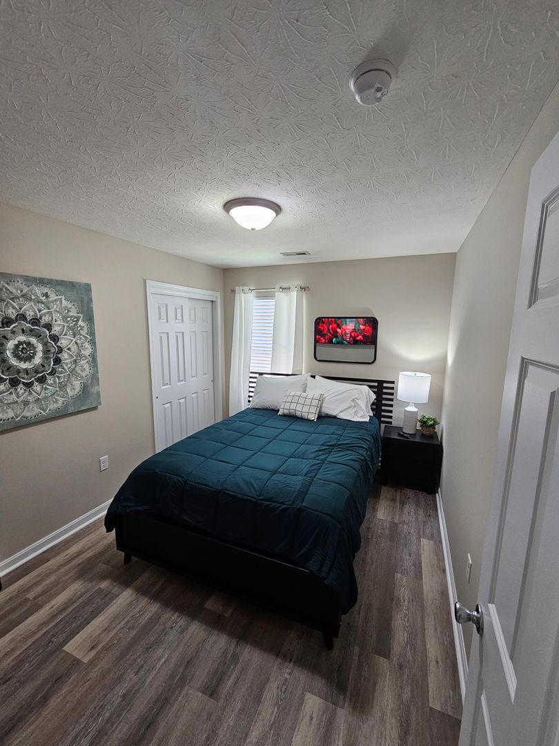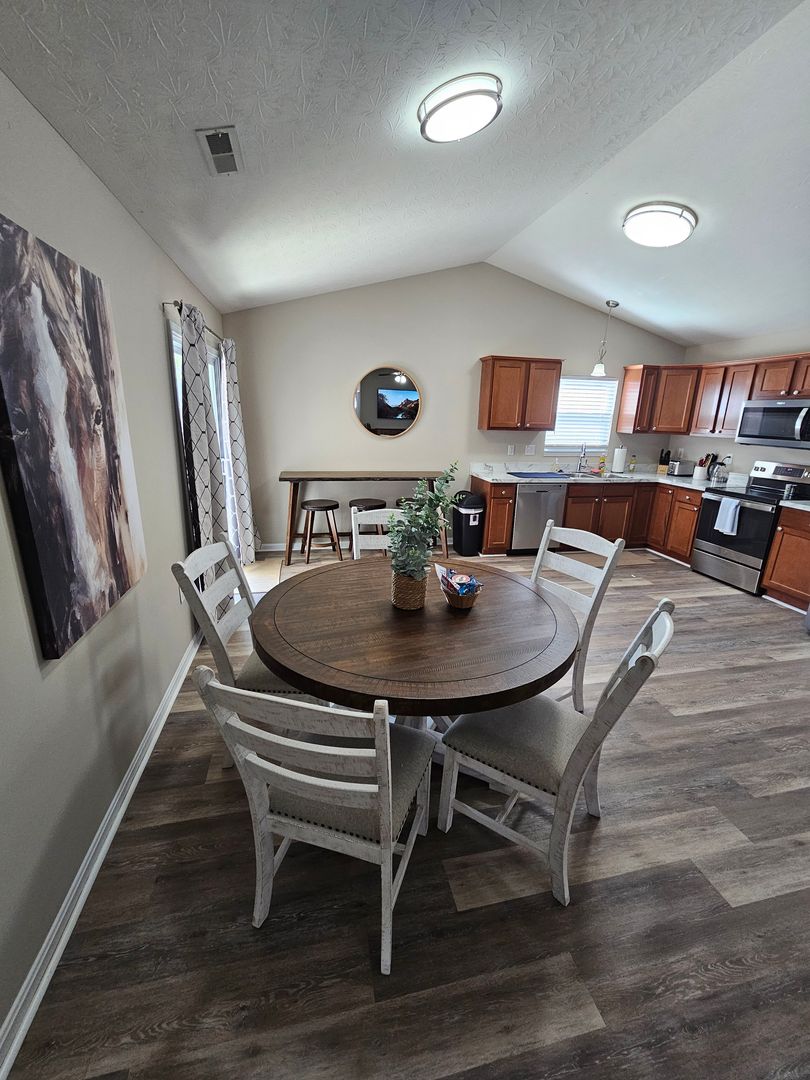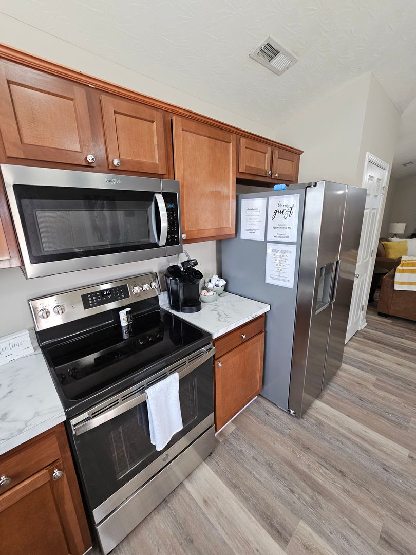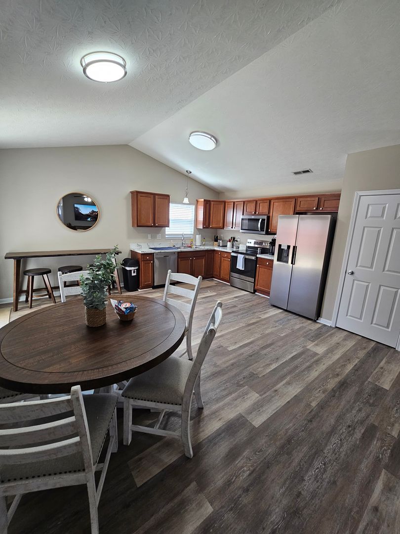 Welcome to this charming single-level home located in the heart of Hamilton, Ohio. This property boasts three spacious bedrooms and two full bathrooms, perfect for comfortable living. The full kitchen is equipped with modern appliances including a dishwasher, oven, microwave, stove, refrigerator, and even a hot water kettle. For coffee lovers, a coffee maker is provided along with complimentary coffee. Wine enthusiasts will appreciate the inclusion of wine glasses. The home also features room darkening shades for a restful sleep and ample clothing storage. For your convenience, a washer and dryer are available on-site. The private backyard and back patio offer a great space for relaxation or entertaining, complete with a BBQ grill. Stay connected with free WiFi and enjoy your favorite shows on the smart TVs. The home also includes a private entrance, free parking on the premises, and allows for long-term stays. For your comfort, the home is equipped with air conditioning, heating, and ceiling fans. Essentials are included for your stay and cleaning is available during your stay. Safety features include a smoke alarm, fire extinguisher, and first aid kit. This home truly offers all the comforts and conveniences for a memorable stay in Hamilton, Ohio.