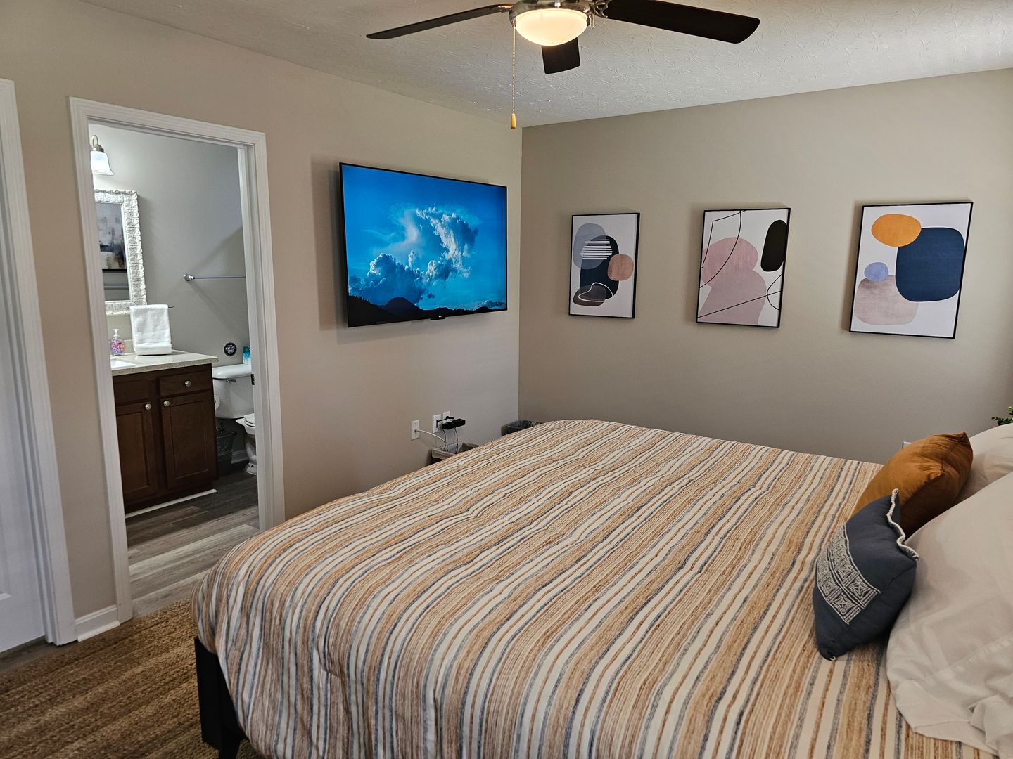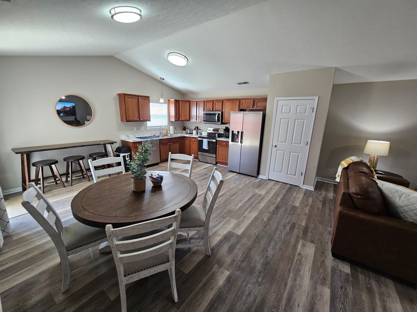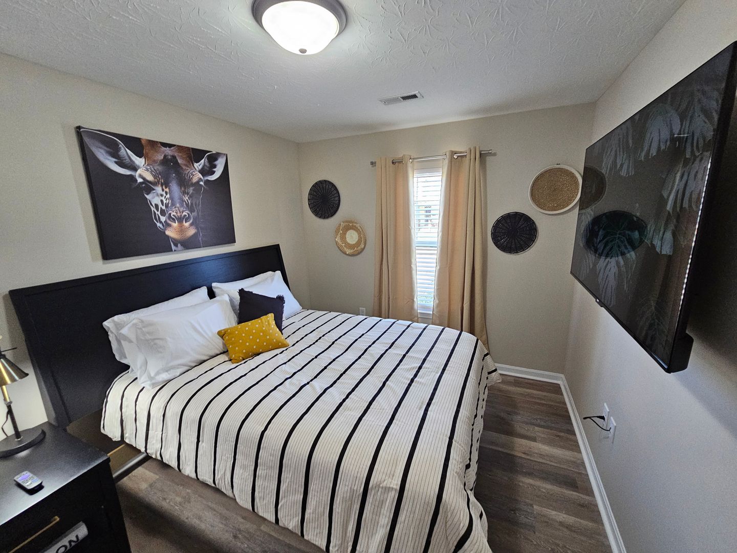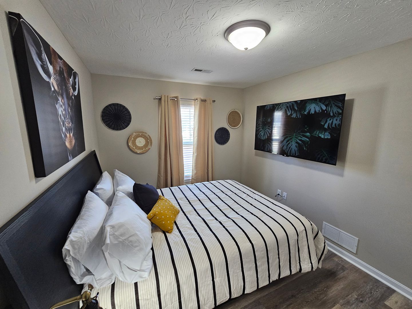 Welcome to this charming single-level home located in the heart of Hamilton, Ohio. This property boasts three spacious bedrooms and two full bathrooms, perfect for comfortable living. The full kitchen is equipped with modern appliances including a dishwasher, oven, microwave, stove, refrigerator, and even a hot water kettle. For coffee lovers, a coffee maker is provided along with complimentary coffee. Wine enthusiasts will appreciate the inclusion of wine glasses. The home also features room darkening shades for a restful sleep and ample clothing storage. For your convenience, a washer and dryer are available on-site. The private backyard and back patio offer a great space for relaxation or entertaining, complete with a BBQ grill. Stay connected with free WiFi and enjoy your favorite shows on the smart TVs. The home also includes a private entrance, free parking on the premises, and allows for long-term stays. For your comfort, the home is equipped with air conditioning, heating, and ceiling fans. Essentials are included for your stay and cleaning is available during your stay. Safety features include a smoke alarm, fire extinguisher, and first aid kit. This home truly offers all the comforts and conveniences for a memorable stay in Hamilton, Ohio.