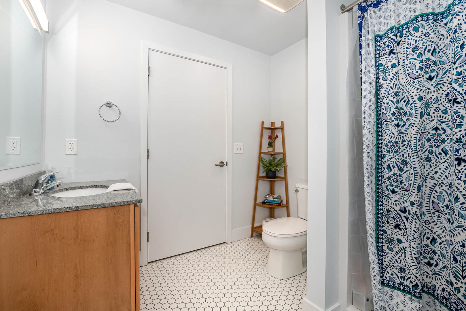 Located in the entrance hallway, this bathroom features a full length mirror and a tub/shower combination.