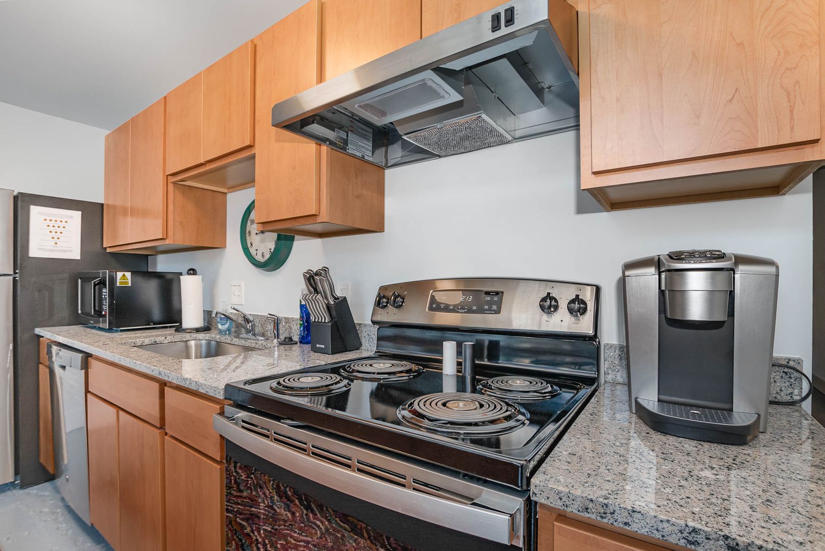 Full kitchen with brand new appliance, including a Keurig and coffee pods. Four barstools make it easy to eat at the kitchen island.