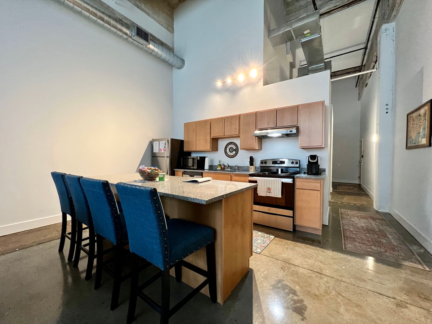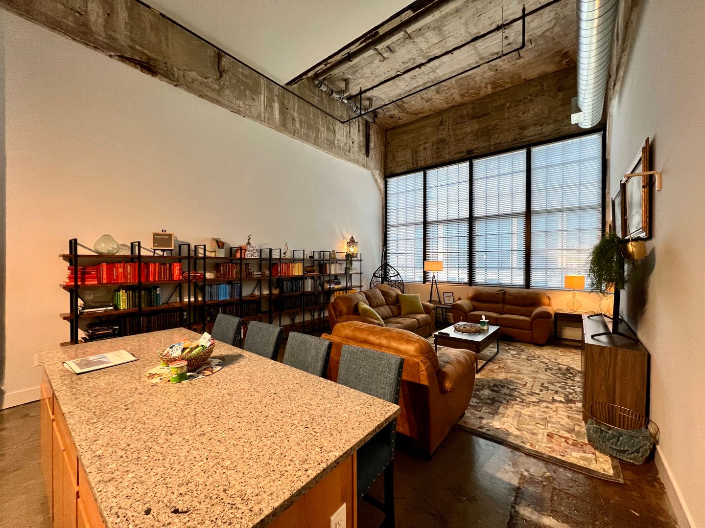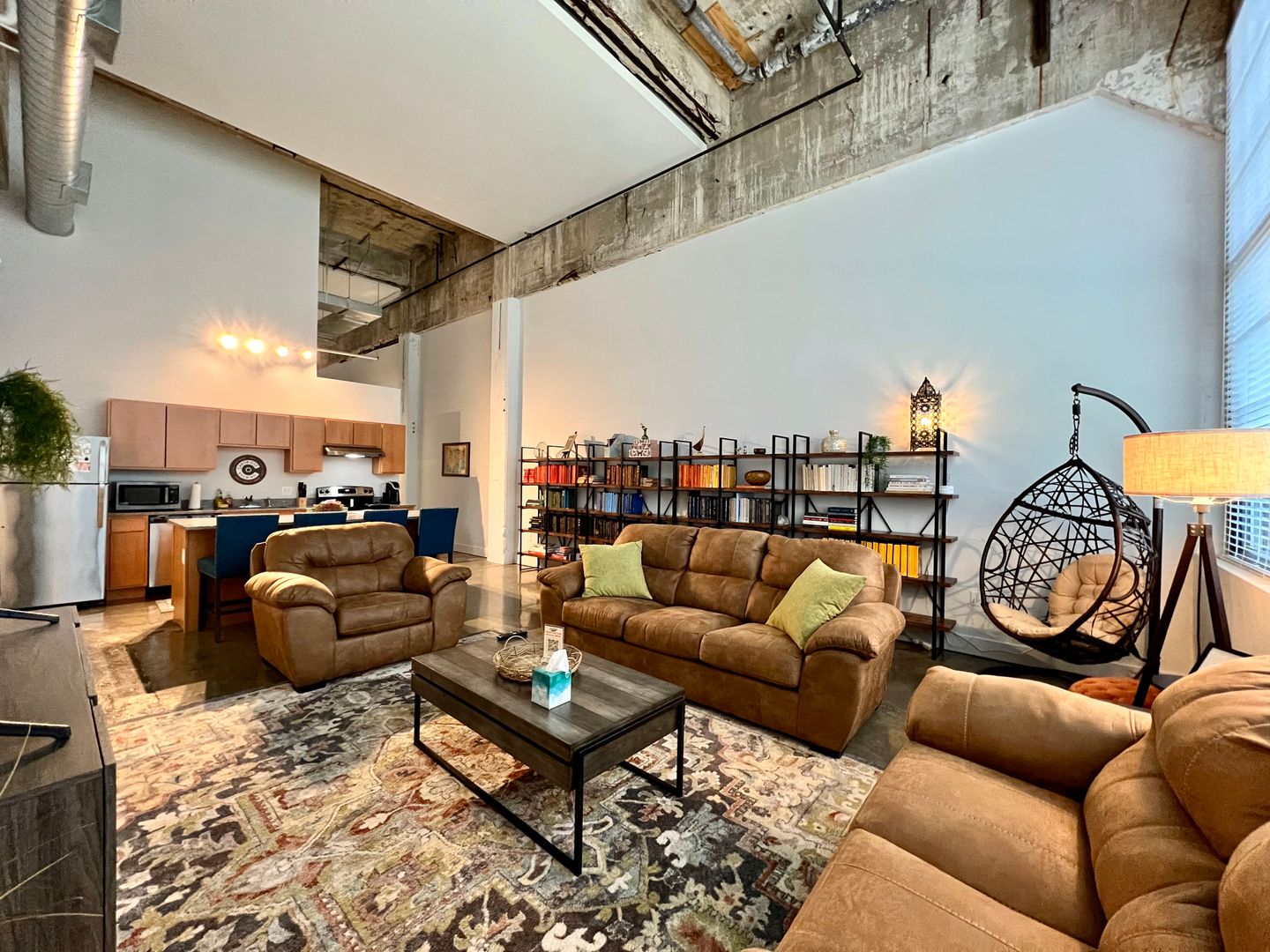 The inside of your loft features an open-concept floor plan with a massive 13-foot ceiling. Enjoy chatting with your guests from anywhere in the main living area.