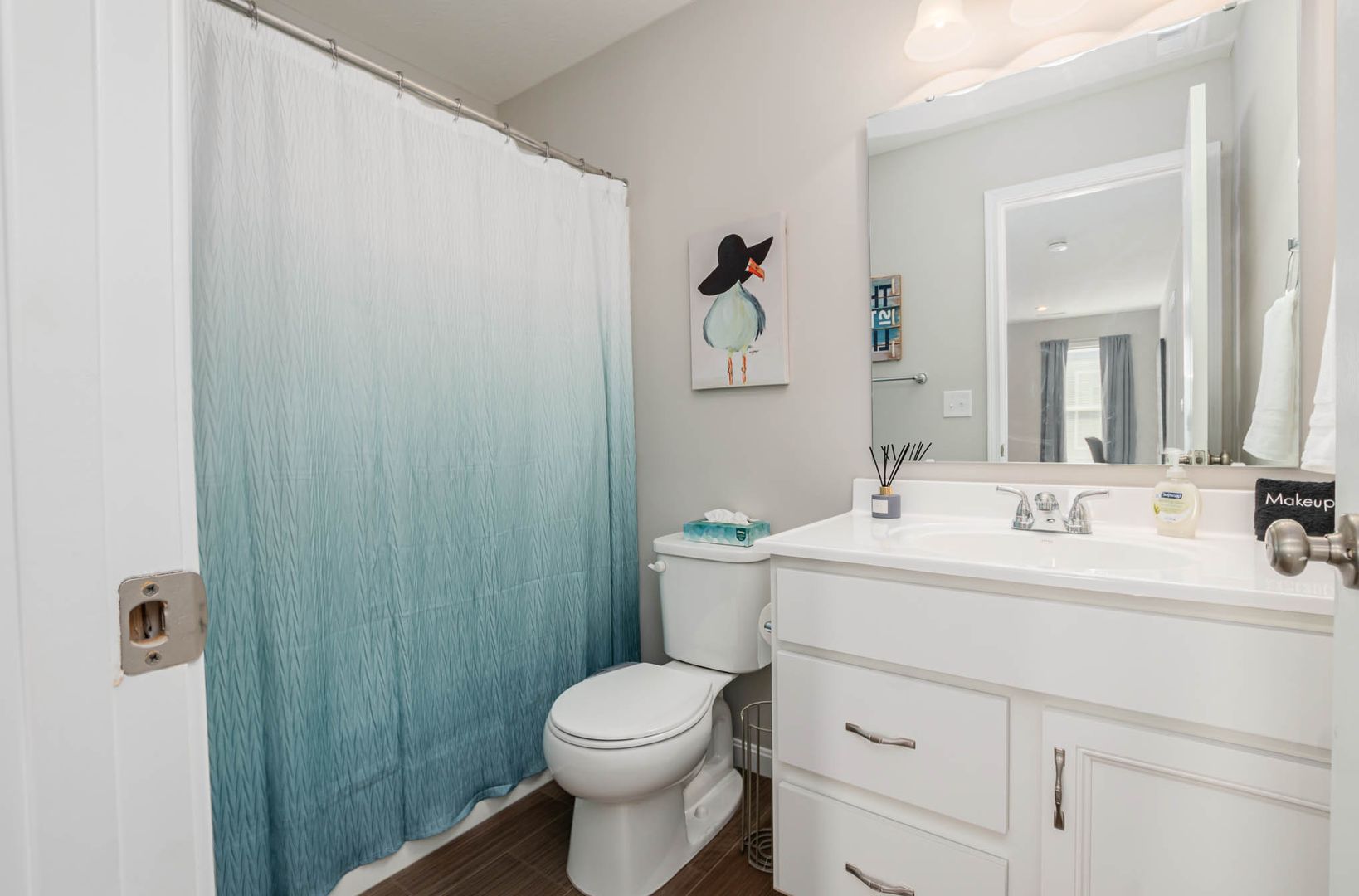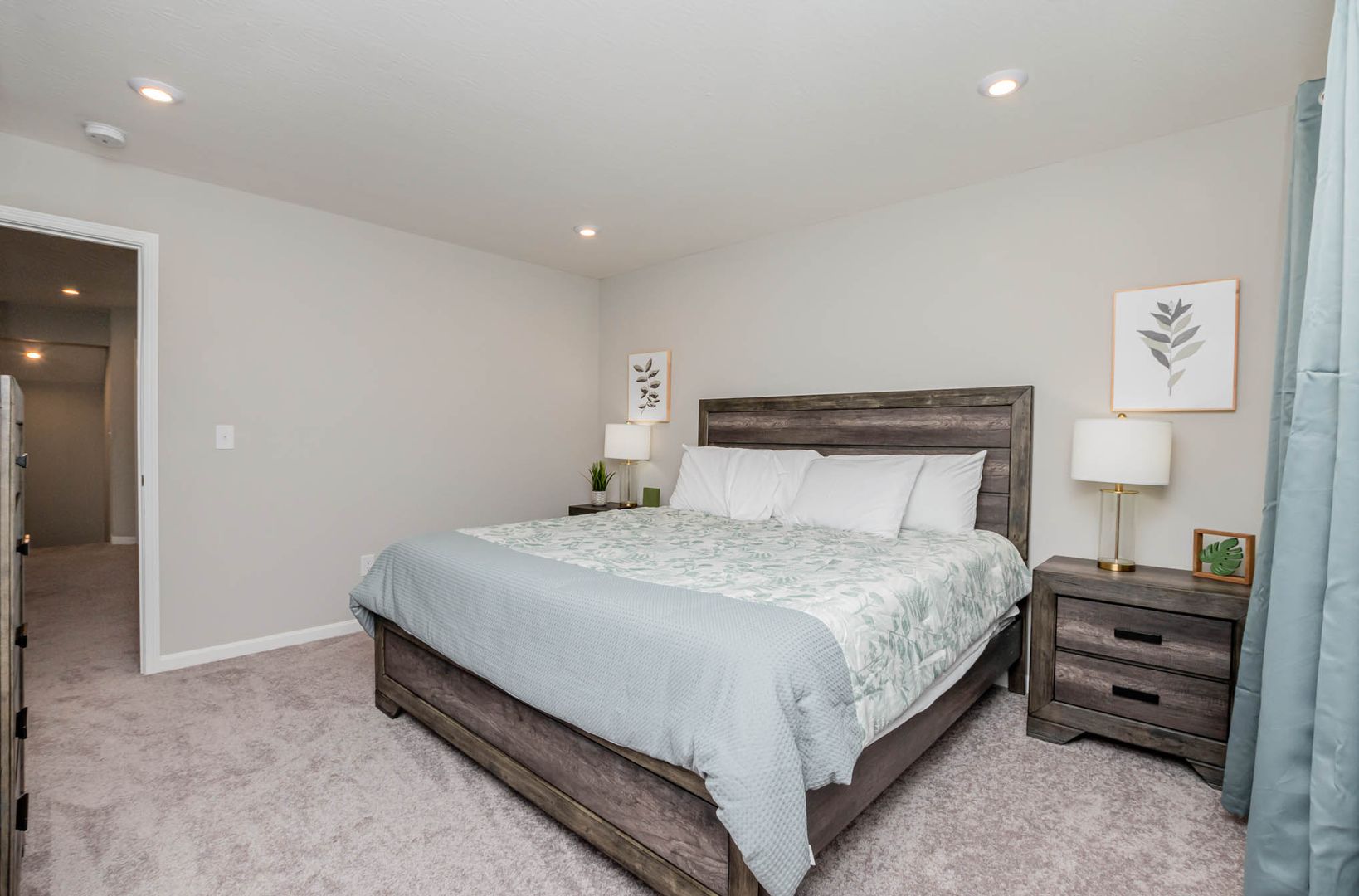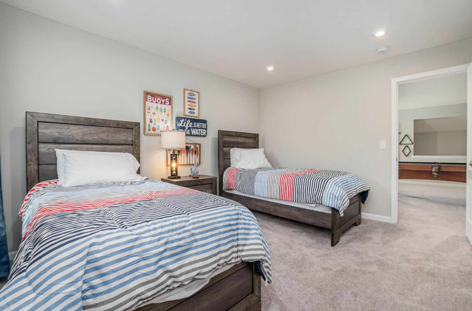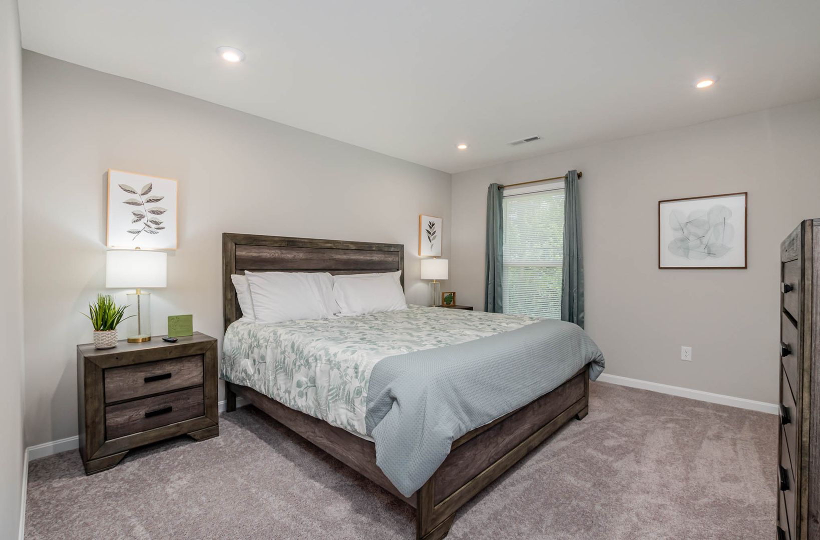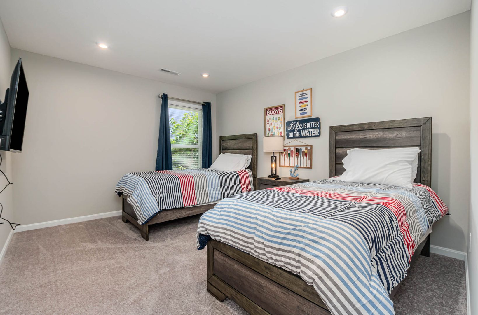 There are two bedrooms located on the second floor along with a full bathroom with a shower/tub combination. The queen bedroom has a dresser and closet. The king bedroom has a smart TV and closet.