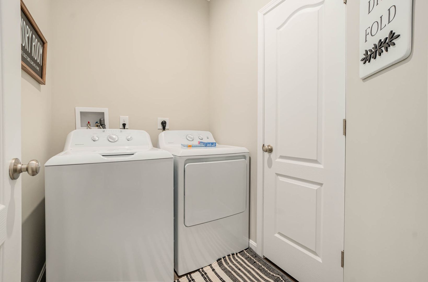 Down the hall from the kitchen you will find a large pantry, a half bathroom, and a laundry room with full-size washer and dryer. If you peek in the closet you will find the iron, ironing board, detergent, dryer sheets and cleaning supplies.