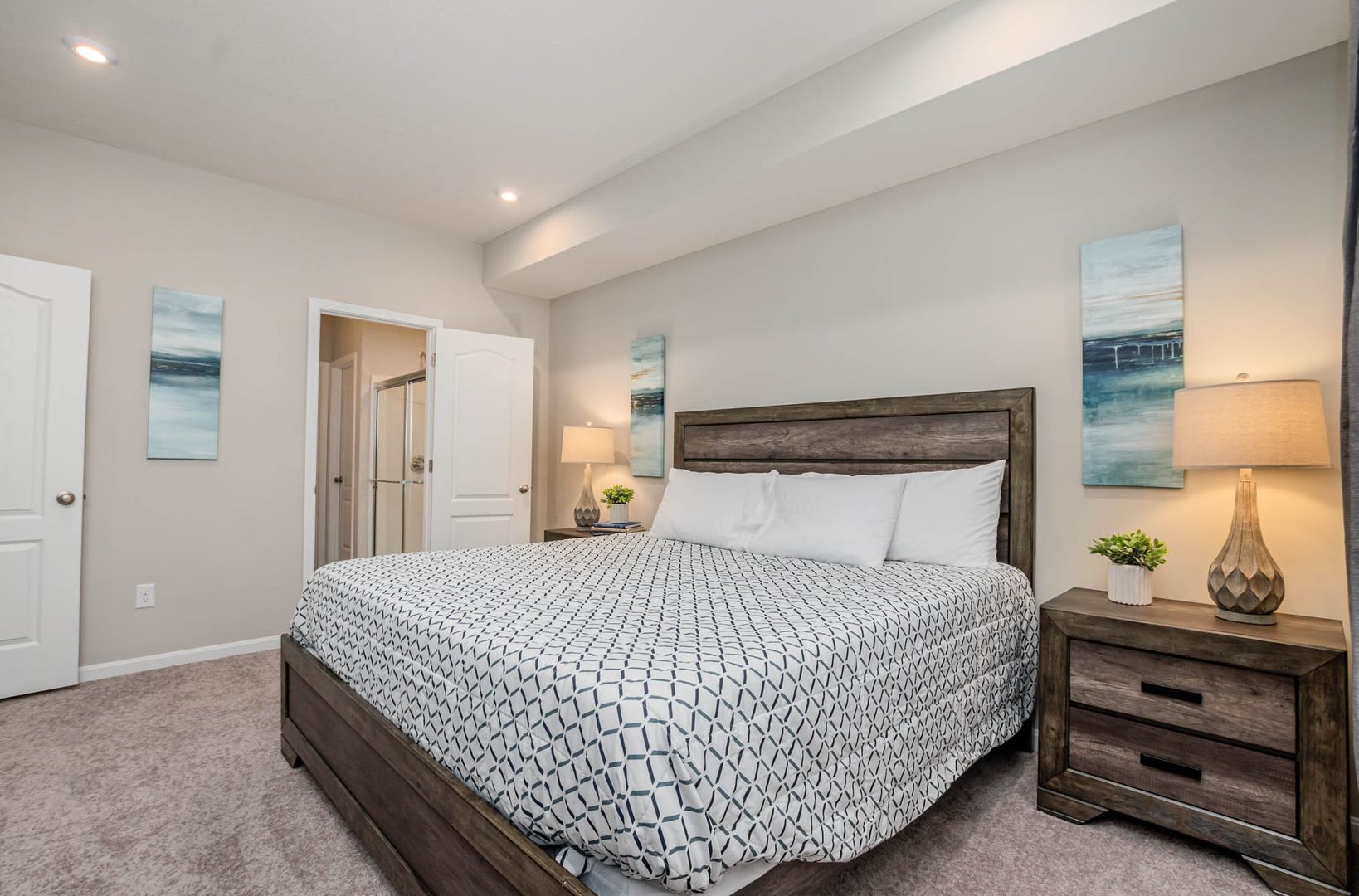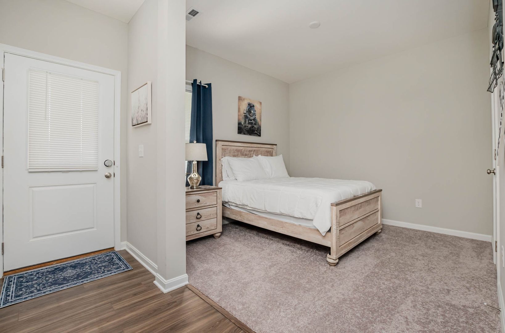 There are two bedrooms on the main floor which require no steps! The double bedroom with small closet is directly to the left when you enter the home. The master suite with king bed, smart TV, walk-in closet, and walk-in shower are located at the back of the home.