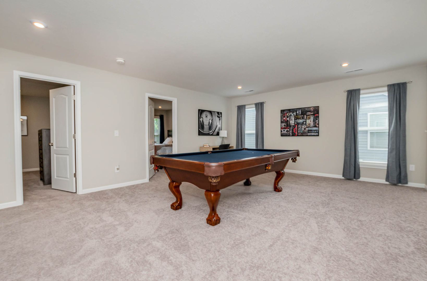 Up a larger flight of carpeted steps you will walk-into the room that you can work and play in! During work hours, we have a large desk and comfortable chair to so you can get down to business. After the sun goes down, enjoy TV on the large smart TV and play a game of pool.
