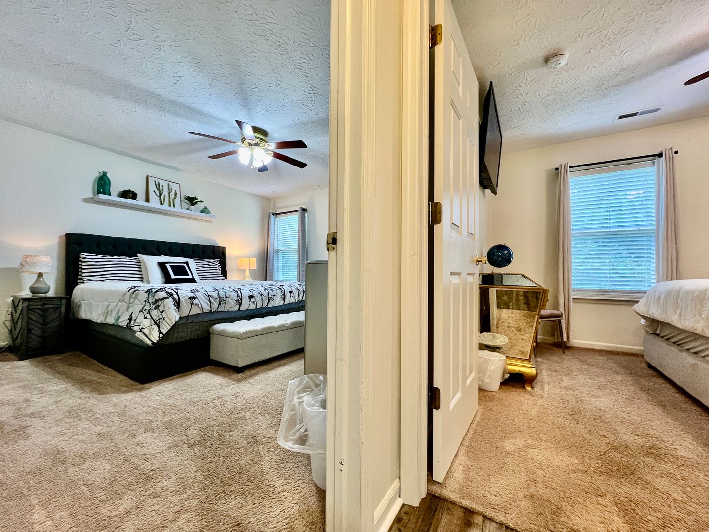 This king-size bed is located in the back of the house. You can open the back door and step right out on the patio from the bedroom. There is plenty of storage in the dresser and closet, a ceiling fan to keep you cool, plus a full mirror to ensure you look your best! Of course, this room is also equipped with a Roku TV. This room has its own ensuite full bathroom.