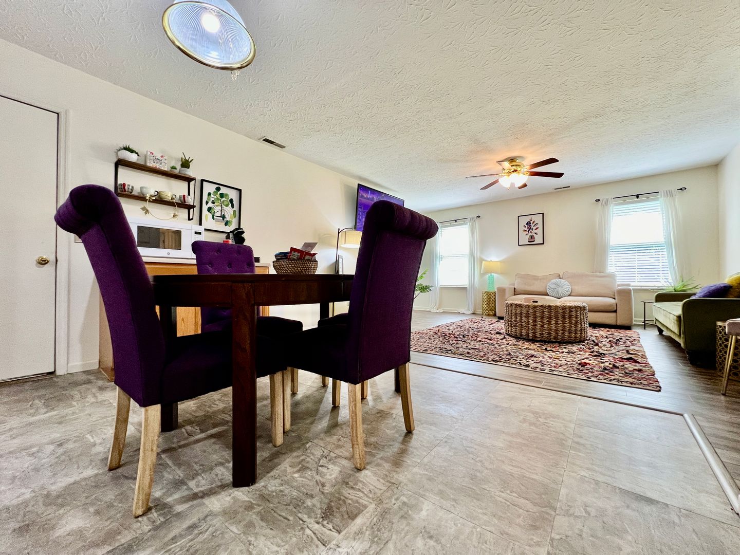 This kitchen has everything you need for your stay, including a Keurig coffee maker (with plenty of coffee), microwave, dishwasher, and stovetop oven. The kitchen table seats four people comfortably. Since this is open to the living room, you can enjoy the TV while sitting at the table.